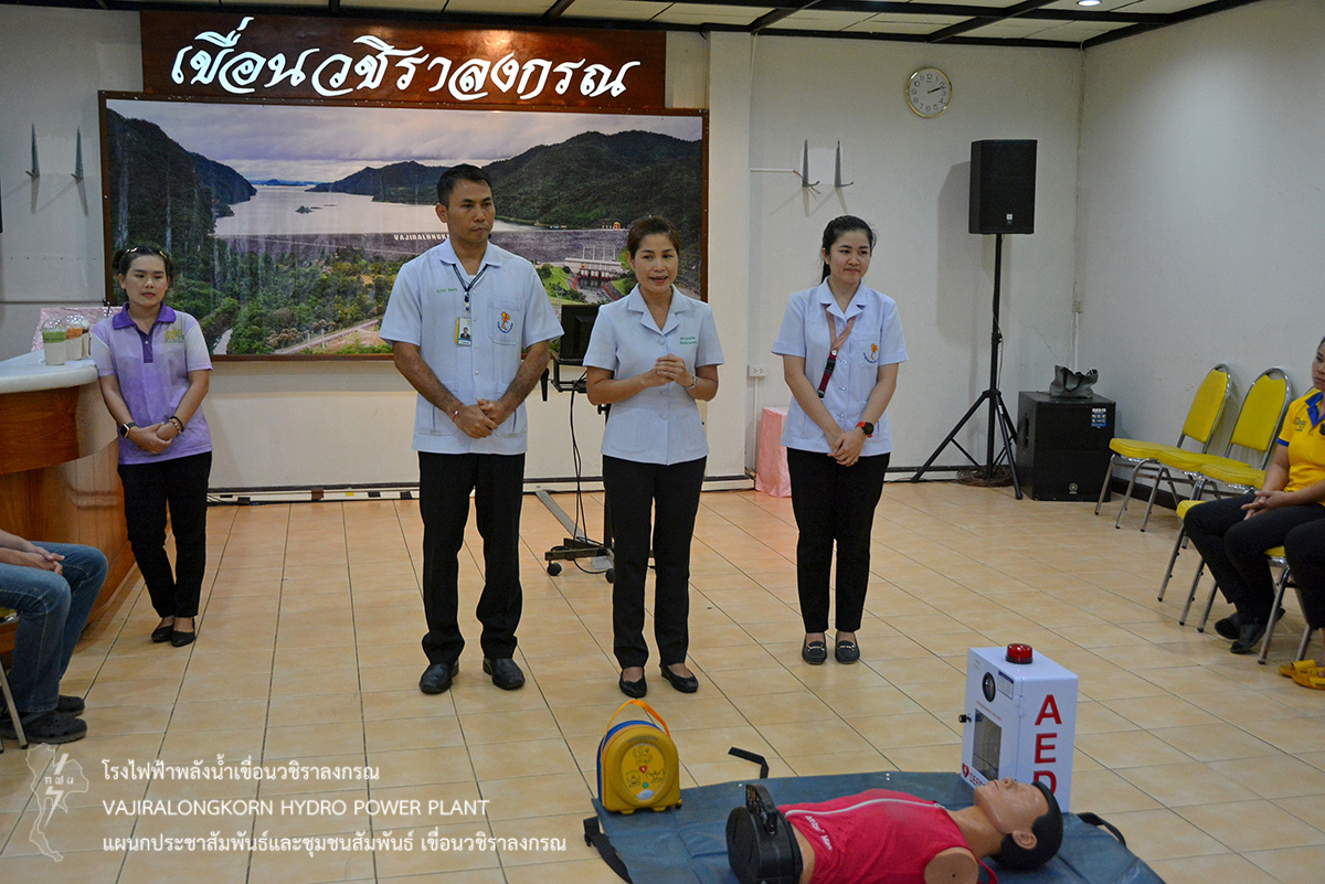เมื่อวันที่ 16-17 กันยายน 2562 นางภัสภรณ์ หลอดศิริ หัวหน้าแผนกสุขภาพอนามัยเขื่อนวชิราลงกรณ และผู้ปฏิบัติงานแผนกสุขภาพอนามัยเขื่อนวชิราลงกรณ จัดอบรมหลักสูตร การช่วยชีวิตขั้นพื้นฐานและการใช้เครื่อง AED ให้กับผู้ปฏิบัติงาน และลูกจ้างเขื่อนวชิราลงกรณ