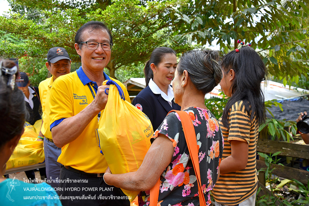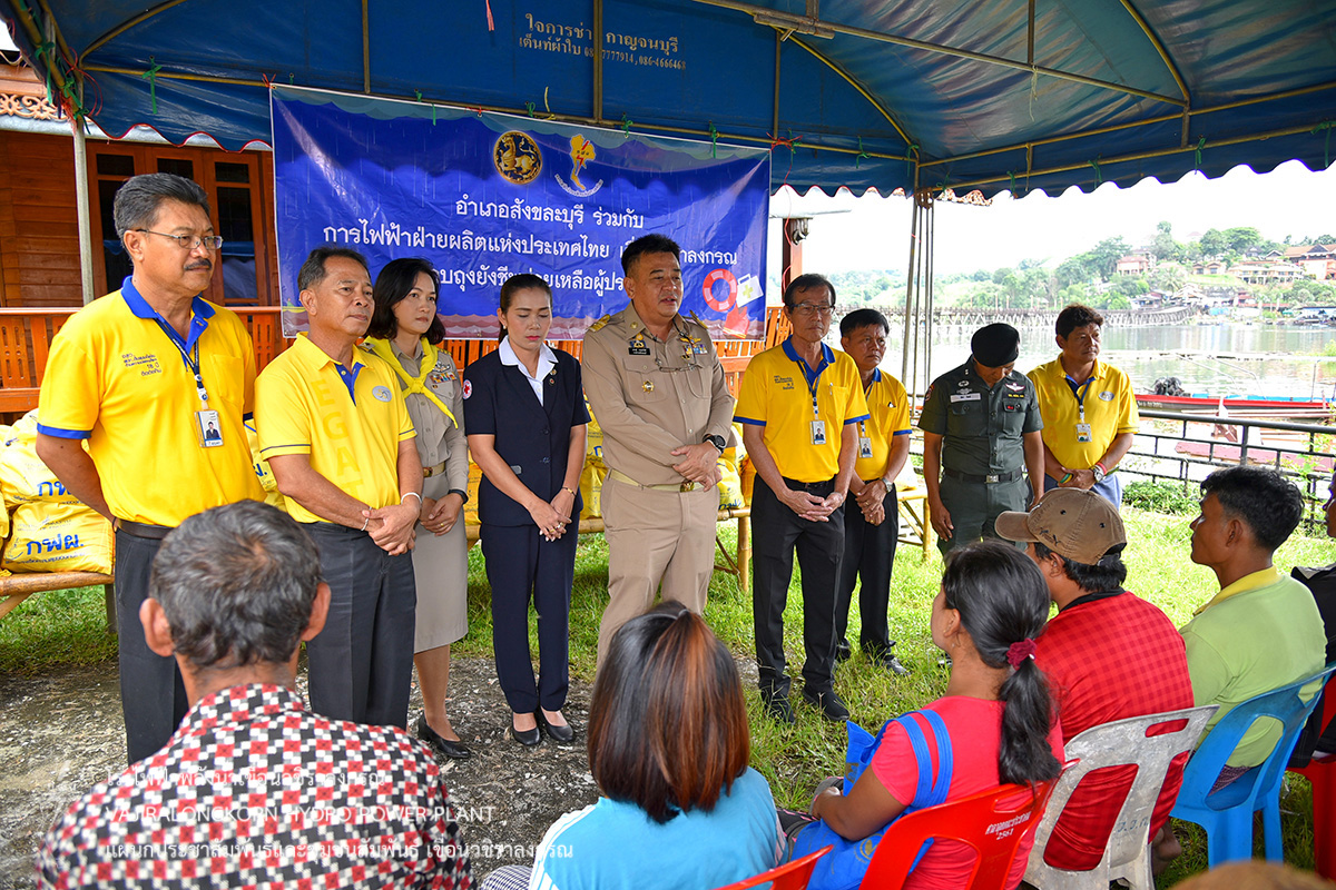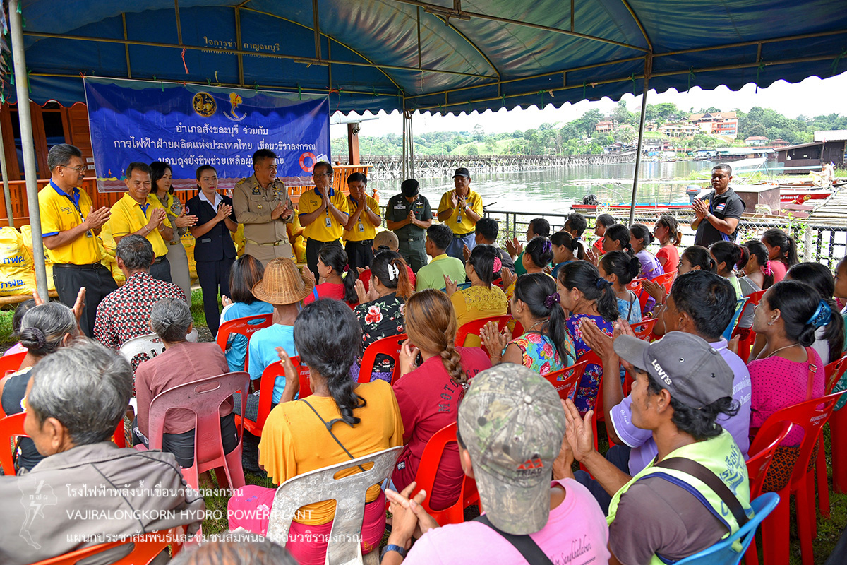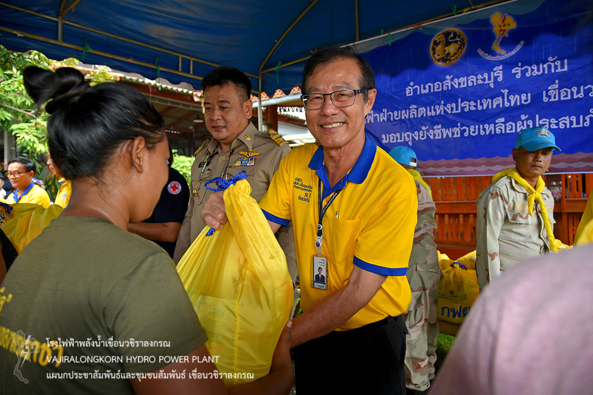 โดยมอบถุงยังชีพให้กับประชาชนที่ประสบอุทกภัย ณ บ้านเรดาห์ จำนวน 46 ราย ชุมชนบริเวณริมฝั่ง สะพานมอญ จำนวน 110 ราย ณ ท่าเรือท่องเที่ยว และชุมชนบ้านหลังเขา จำนวน 16 ราย เป็นจำนวนทั้งหมด 172 ราย โดยมีนายปกรณ์ กรรณวัลลี นายอำเภอสังขละบุรี ตัวแทนผู้ประสานงานชุมชน และประชาชนที่รับมอบถุงยังชีพ ร่วมให้การต้อนรับ คณะการไฟฟ้าฝ่ายผลิตแห่งประเทศไทย เขื่อนวชิราลงกรณ และคอยอำนวยความสะดวก และร่วมมอบสิ่งของเครื่องอุปโภคและบริโภคให้กับประชาชน เพื่อช่วยบรรเทาทุกข์และเป็นขวัญกำลังใจในการดำรงชีพ ของพี่น้องประชาชนชาวสังขละบุรีต่อไป