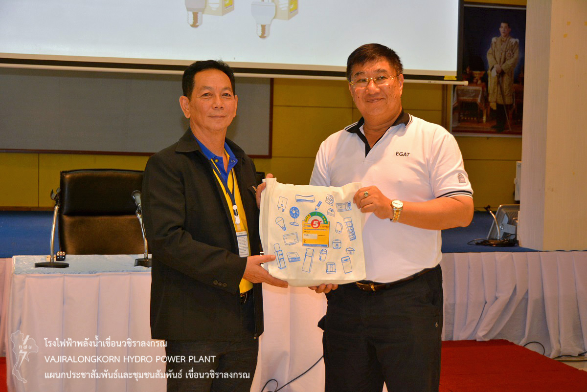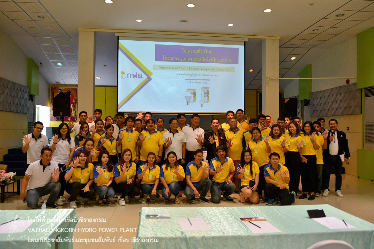 เมื่อวันที่ 21 กันยายน 2562 นายอภิรักษ์ ทองโต วิศวกรระดับ 11 เขื่อนวชิราลงกรณ ให้การต้อนรับนายวีระพงษ์ เอี่ยมวัฒน์ ผู้ช่วยผู้อำนวยการฝ่ายบริหารด้านการใช้ไฟฟ้าและกิจการเพื่อสังคม-1 ในโอกาสนำคณะผู้ประกอบการเบอร์ 5 กลุ่มไฟฟ้าแสงสว่าง และผู้วางจำหน่าย (outlet) จำนวน 60 คน ร่วมกิจกรรมสัมพันธ์ ระหว่าง กฟผ. กับหน่วยงานพันธมิตร ในโครงการฉลากประหยัดไฟฟ้าเบอร์ 5 พร้อมจัด Workshop การดำเนินงานเกี่ยวกับโครงการฉลากประหยัดไฟฟ้าประสิทธิภาพสูงเบอร์ 5 ในอนาคต และการดำเนินโครงการฯ กับแนวคิด Circular Economy พร้อมฟังบรรยายด้านการผลิตกระแสไฟฟ้าจากพลังน้ำ ณ อาคารภูมิสุวรรณ เขื่อนวชิราลงกรณ
