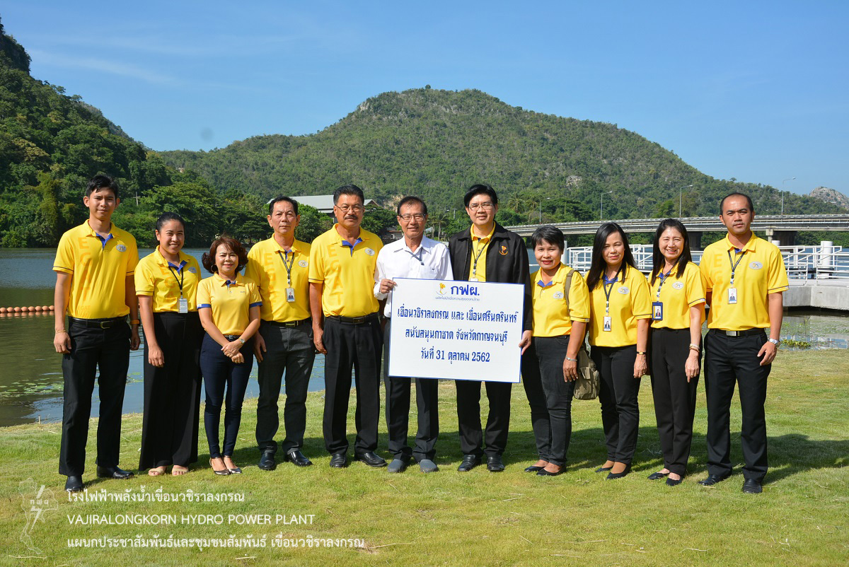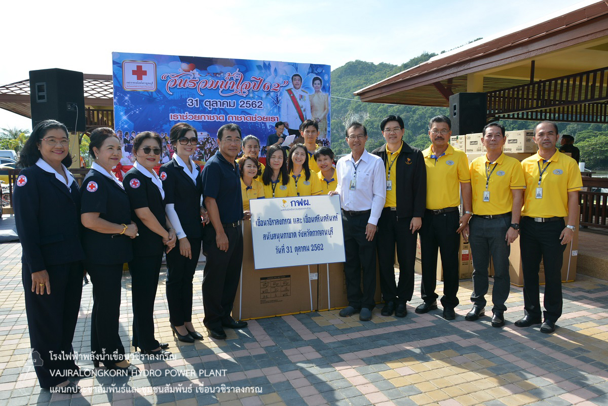 เมื่อวันที่ 31 ตุลาคม 2562 นายไววิทย์ แสงพานิชย์ ผู้อำนวยการเขื่อนวชิราลงกรณ นายนภฤทธิ์ ผดุงศรี ผู้ช่วยผู้อำนวยการเขื่อนวชิราลงกรณ-1 นายอภิรักษ์ ทองโต วิศวกรระดับ 11 เขื่อนวชิราลงกรณ และนายชวลิต กันคำ วิศวกรระดับ 11 เขื่อนศรีนครินทร์ ร่วมกันมอบอุปกรณ์ไฟฟ้า ประกอบด้วย ตู้เย็น เครื่องซักผ้า ทีวี LED และหลอดไฟ LED รวมเป็นเงิน 102,000 บาท ให้กับนายจีระเกียรติ ภูมิสวัสดิ์ ผู้ว่าราชการจังหวัดกาญจนบุรี ประธานรับมอบ เพื่อสนับสนุนการจัดงานกาชาดจังหวัดกาญจนบุรี พร้อมด้วยผู้บริหาร ผู้ปฏิบัติงาน และคณะเหล่ากาชาดจังหวัดกาญจนบุรี เข้าร่วมพิธีรับมอบ พร้อมกับหน่วยงานราชการ รัฐวิสาหกิจ องค์กรปกครองส่วนท้องถิ่น เอกชน และทุกภาคส่วน ร่วมมอบสิ่งของสนับสนุน "งานวันรวมน้ำใจ" ณ จวนผู้ว่าราชการจังหวัดกาญจนบุรี