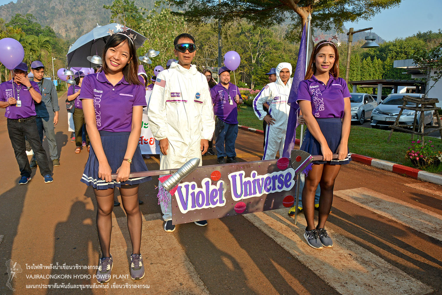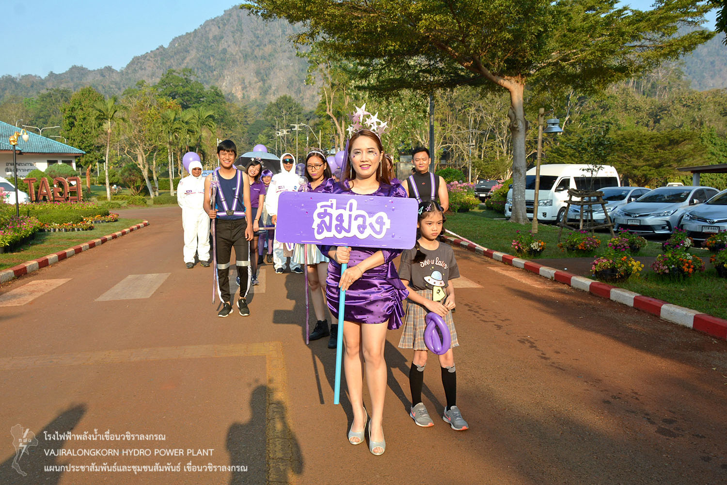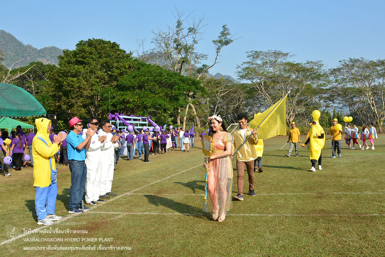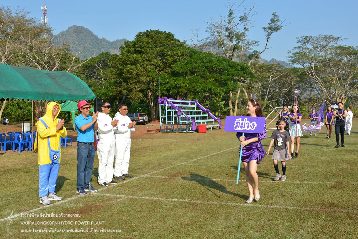 และขบวนพาเหรดนักกีฬาสีม่วง นำโดยนายธนสาร ฐานะวุฑฒ์ ผู้ช่วยผู้อำนวยการเขื่อนวชิราลงกรณ-2. แม่สี พร้อมด้วยนายเศรษฐพงษ์ ฮามคำไพ วิศวกรระดับ 11 นายวีระพล สาระพจน์ หัวหน้ากองบำรุงรักษาโรงไฟฟ้า (กบว-ฟ.) น.ส.อาจารี ศิริประพฤทธิ์ หัวหน้ากองบริหาร (กบหว-ฟ.) พร้อมด้วยผู้บริหาร ผู้ปฏิบัติงาน ลูกจ้างเหมา มีการรณรงค์ขบวนพาเหรด การใช้ถุงผ้าและนำปิ่นโตใส่อาหารแทนการใช้ถุงพลาสติก การคัดแยกขยะ อนุรักษ์พลังงาน น้ำมัน น้ำประปา และไฟฟ้า