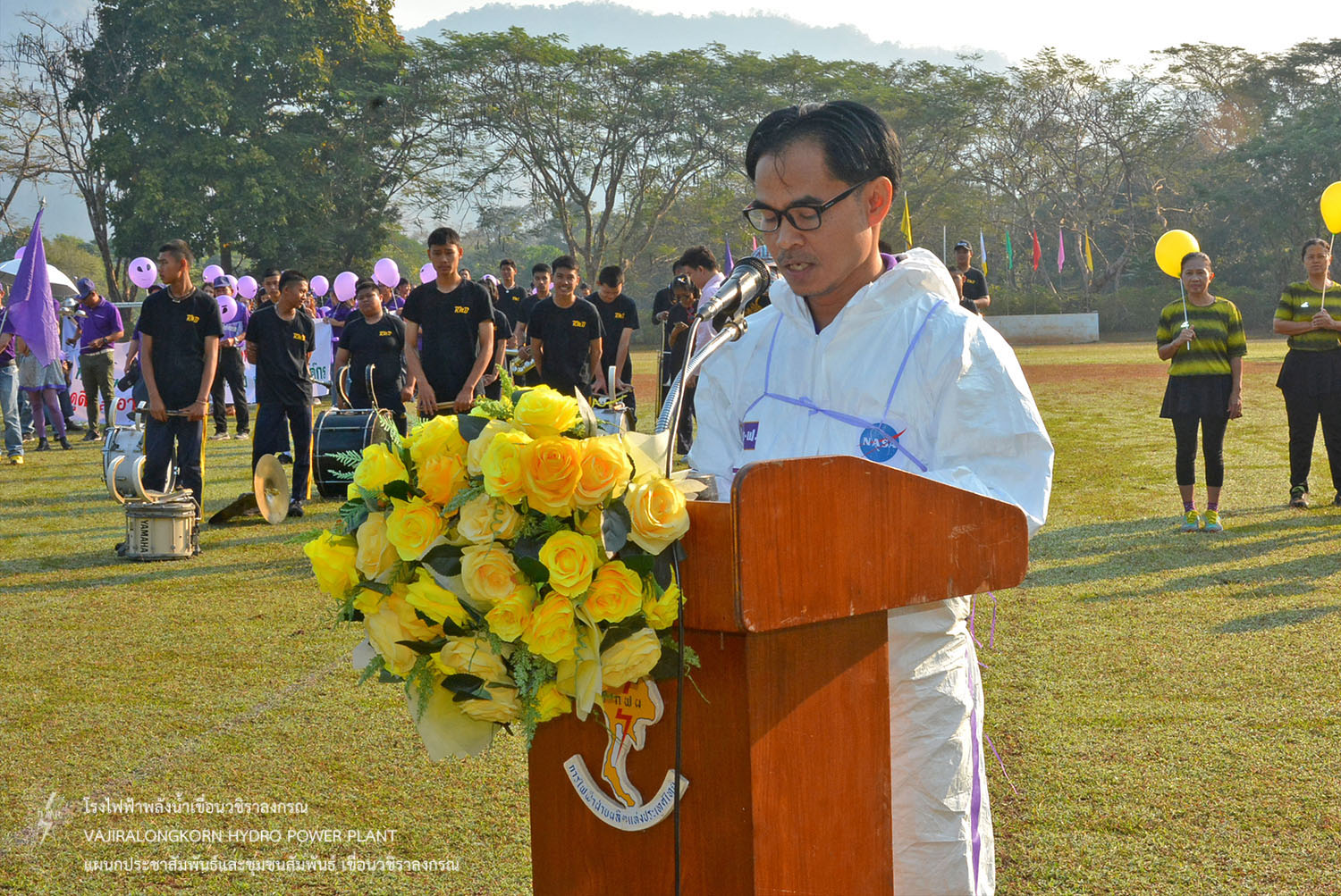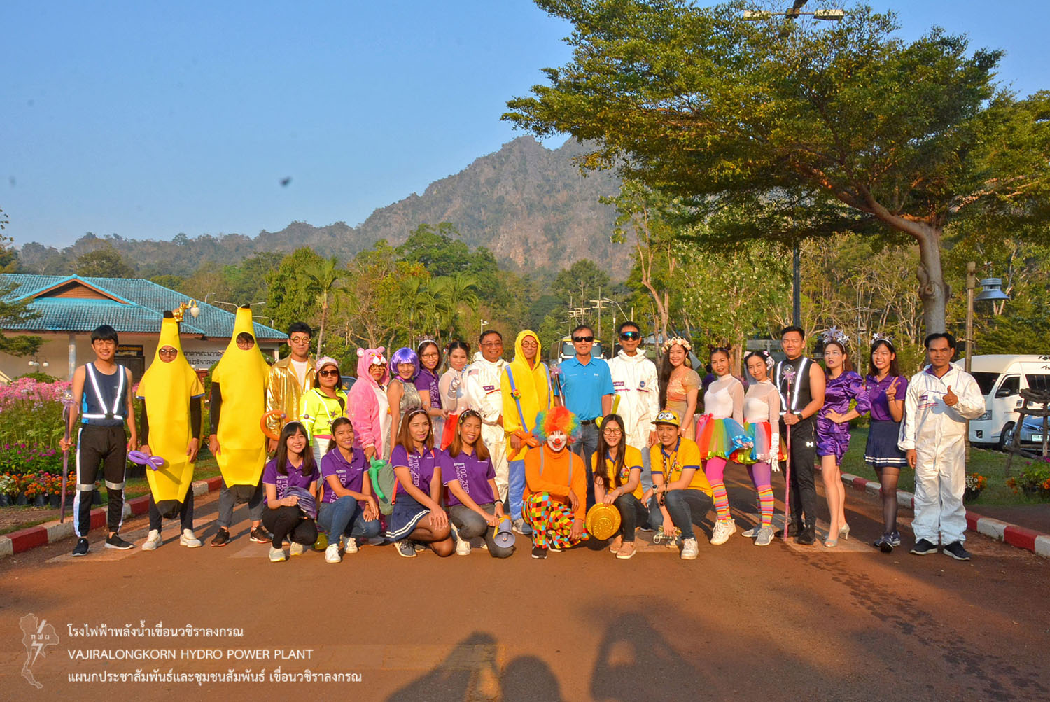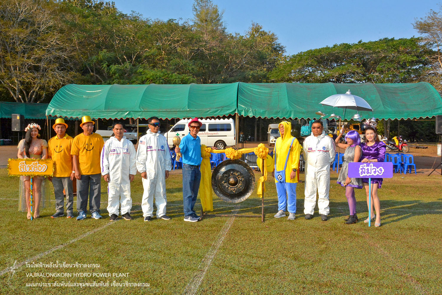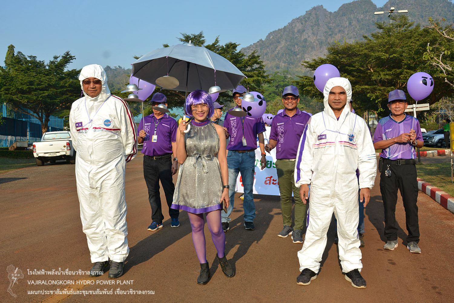 และขบวนพาเหรดนักกีฬาสีม่วง นำโดยนายธนสาร ฐานะวุฑฒ์ ผู้ช่วยผู้อำนวยการเขื่อนวชิราลงกรณ-2. แม่สี พร้อมด้วยนายเศรษฐพงษ์ ฮามคำไพ วิศวกรระดับ 11 นายวีระพล สาระพจน์ หัวหน้ากองบำรุงรักษาโรงไฟฟ้า (กบว-ฟ.) น.ส.อาจารี ศิริประพฤทธิ์ หัวหน้ากองบริหาร (กบหว-ฟ.) พร้อมด้วยผู้บริหาร ผู้ปฏิบัติงาน ลูกจ้างเหมา มีการรณรงค์ขบวนพาเหรด การใช้ถุงผ้าและนำปิ่นโตใส่อาหารแทนการใช้ถุงพลาสติก การคัดแยกขยะ อนุรักษ์พลังงาน น้ำมัน น้ำประปา และไฟฟ้า