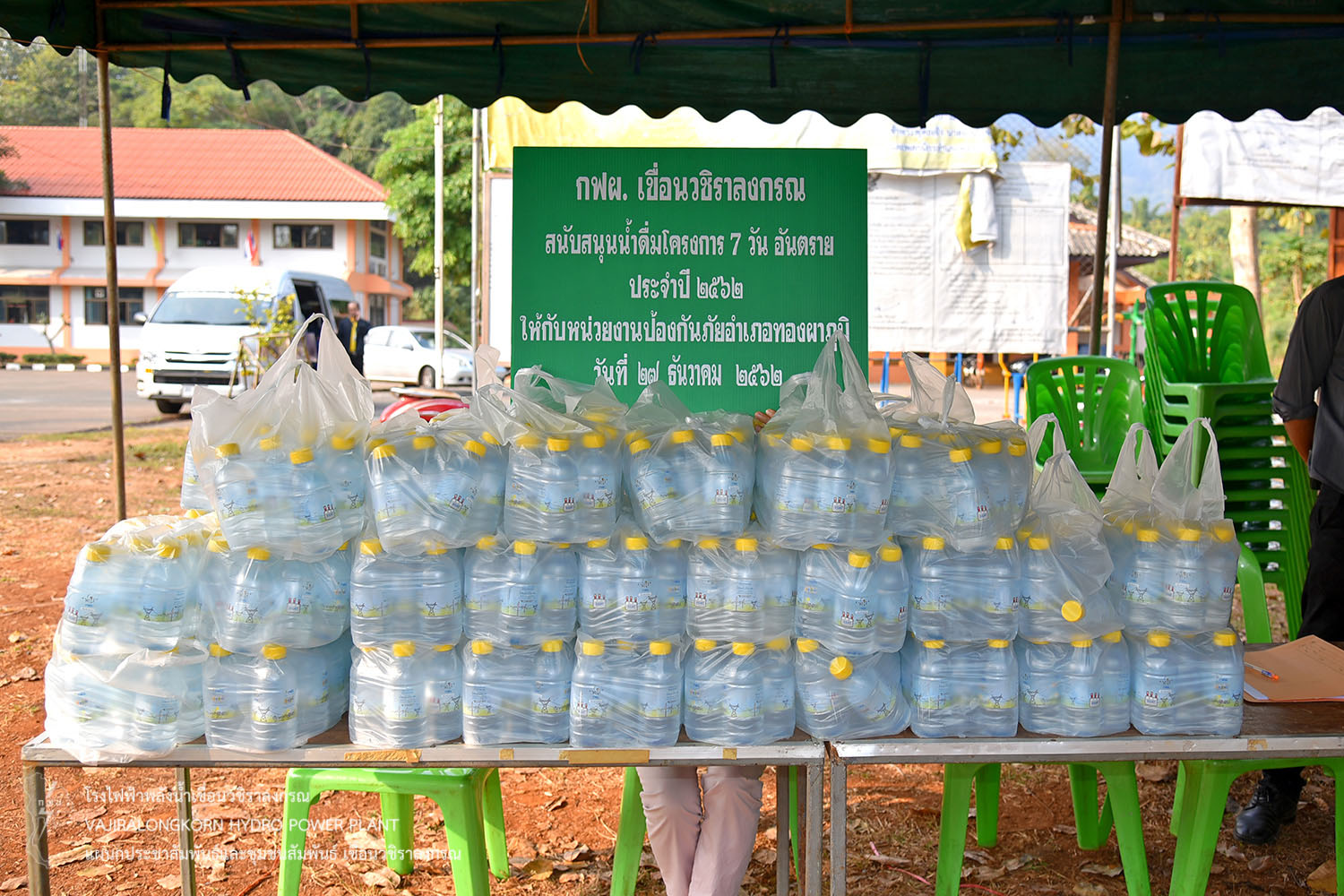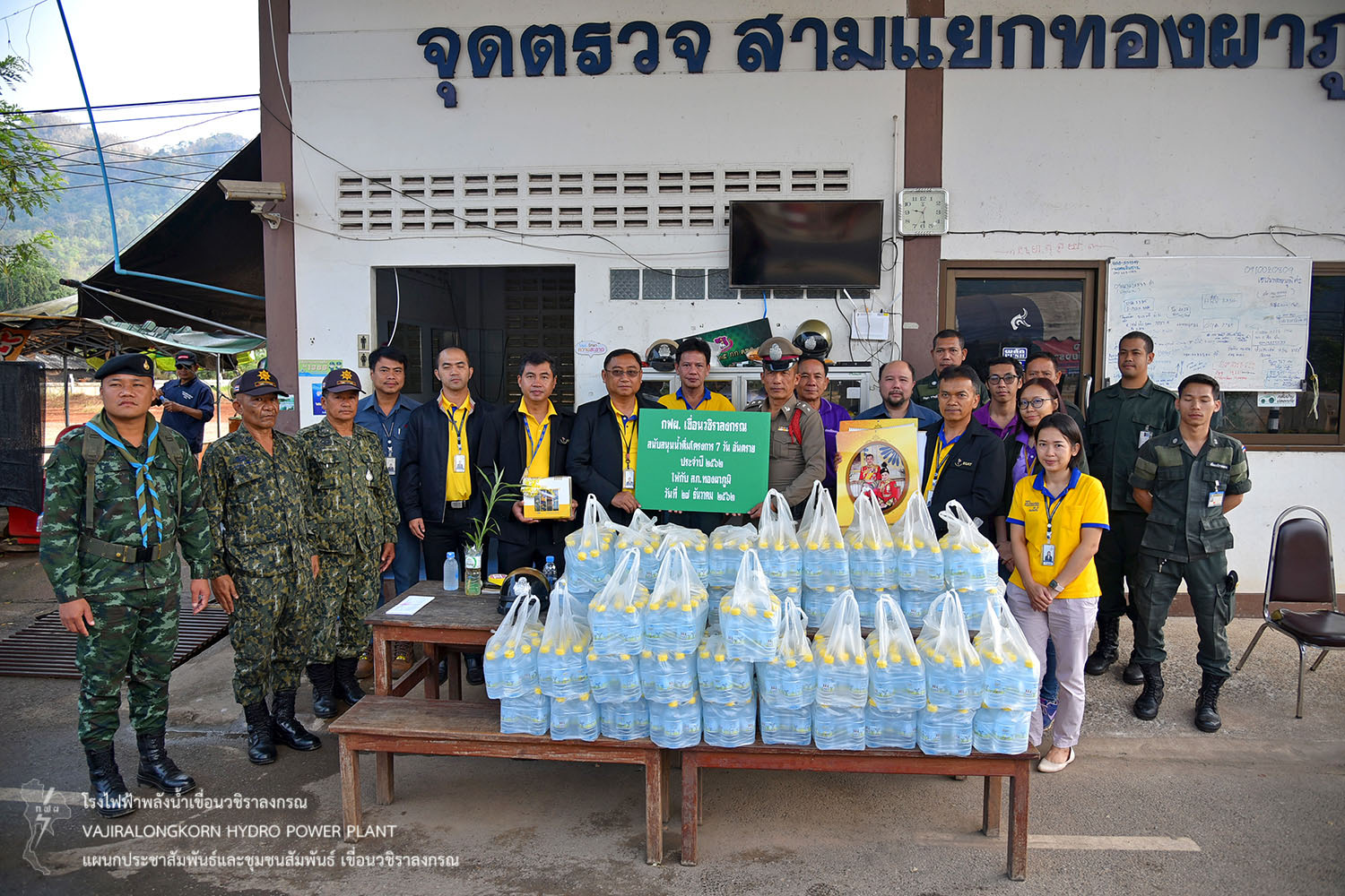 เมื่อวันที่ 27 ธันวาคม 2562 นายเศรษฐพงษ์ ฮามคำไพ วิศวกรระดับ 11 พร้อมด้วยหัวหน้ากอง ผู้บริหาร ผู้ปฏิบัติงานเขื่อนวชิราลงกรณ มอบน้ำดื่ม น้ำใจ กฟผ. ขนาดบรรจุ 350 ซีซี จำนวน 1,200 ขวด สนับสนุนภารกิจโครงการเฝ้าระวัง 7 วันอันตราย ในช่วงเทศกาลส่งท้ายปีเก่า ต้อนรับปีใหม่ โดยแบ่งเป็น 2 จุด คือ จุดบริการประชาชนอำเภอทองผาภูมิและเทศบาลตำบลทองผาภูมิ จำนวน 600 ขวด และสามแยกอำเภอทองผาภูมิ - อำเภอสังขละบุรี จำนวน 600 ขวด
