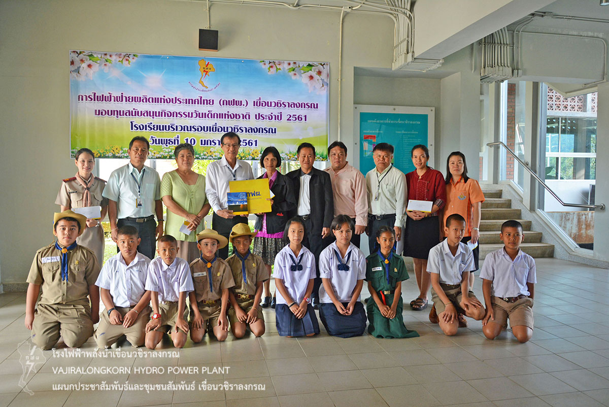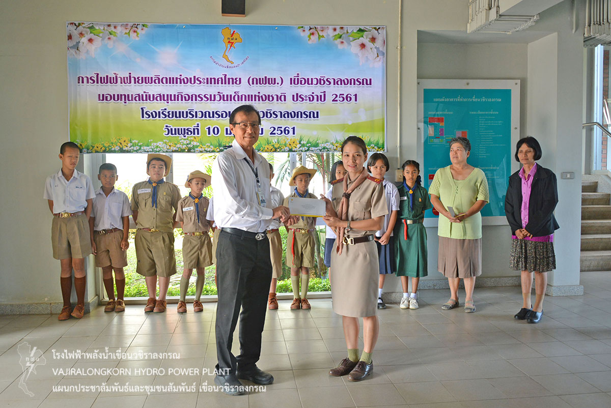 เมื่อวันที่ 10 มกราคม 2561 นายไววิทย์ แสงพานิชย์ ผู้อำนวยการเขื่อนวชิราลงกรณ มอบเงินสนับสนุนวันเด็กแห่งชาติ ประจำปี 2561 ให้กับโรงเรียนที่อยู่ในความดูแลของเขื่อนวชิราลงกรณ และโรงเรียนรอบบริเวณเขื่อนวชิราลงกรณ จากอำเภอทองผาภูมิและอำเภอสังขละบุรี รวม 26 โรงเรียน รวมเป็นเงิน 73,000 บาท โดยมอบให้กับนายภิรมณ์ จันทร์โนติ๊บ ผู้อำนวยการโรงเรียนบ้านประจำไม้ ตำบลห้วยเขย่ง อำเภอทองผาภูมิ และตัวแทนโรงเรียน ประกอบด้วยโรงเรียนบ้านท่ามะเดื่อ ,โรงเรียนบ้านปากลำปิล๊อก ,โรงเรียนบ้านห้วยเขย่ง ,โรงเรียนบ้านไร่ป้า ,โรงเรียนสมาคมป่าไม้แห่งประเทศไทยอุทิศ ตำบลห้วยเขย่ง อำเภอทองผาภูมิ จังหวัดกาญจนบุรี และโรงเรียนบ้านวังผาตาด ,โรงเรียนบ้านดงโคร่ง ตำบลหินดาด อำเภอทองผาภูมิ จังหวัดกาญจนบุรี