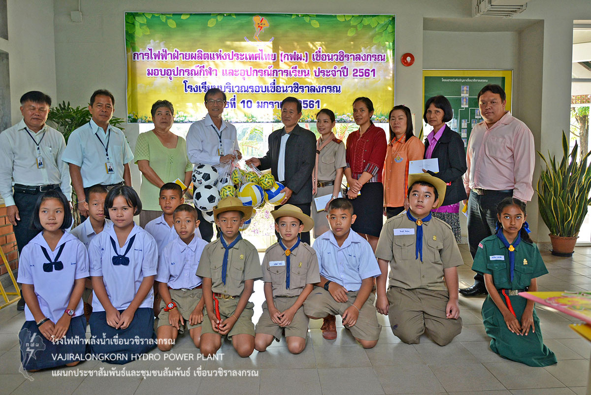 ต่อมานายไววิทย์ แสงพานิชย์ ผู้อำนวยการเขื่อนวชิราลงกรณ มอบอุปกรณ์กีฬา อาทิ ฟุตบอล วอลเลย์บอล ตะกร้อ ไม้แบดพร้อมลูกขนไก่ ไม้ปิงปองพร้อมลูกปิงปอง รวมเป็นเงิน 32,912 บาท ให้กับตัวแทนโรงเรียนบริเวณรอบเขื่อน จำนวน 8 โรงเรียน และมอบปฏิทิน กฟผ. ประจำปี 2561 ให้กับตัวแทนโรงเรียน โดยมีนายสุรพล กองแก้ว หัวหน้ากองบริหารเขื่อนวชิราลงกรณ และนายสม ขุมโมกข์ หัวหน้าแผนกประชาสัมพันธ์และชุมชนสัมพันธ์ เขื่อนวชิราลงกรณ เข้าร่วมมอบ ณ อาคารที่ทำการเขื่อนวชิราลงกรณ