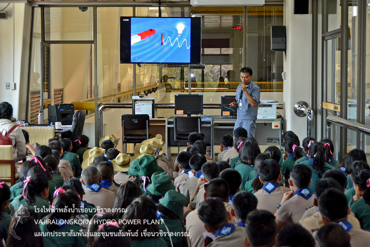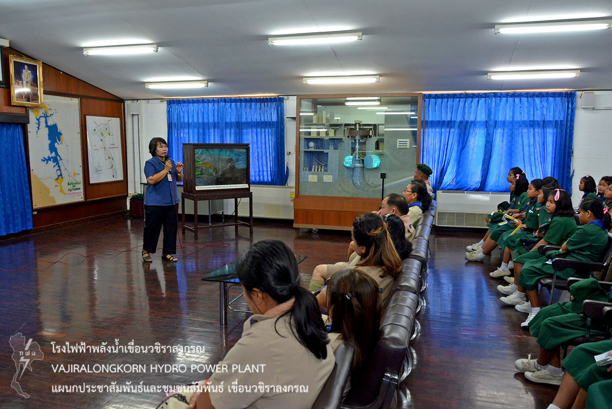 ต่อมานำคณะเข้าชมโรงไฟฟ้าเขื่อนวชิราลงกรณ และฟังบรรยายสรุปขั้นตอนการผลิตไฟฟ้า โดยมีนายไวพจน์ แสงโพธิ์ หัวหน้าแผนกเดินเครื่องกะ 1 กองเดินเครื่อง เขื่อนวชิราลงกรณ เป็นวิทยากร