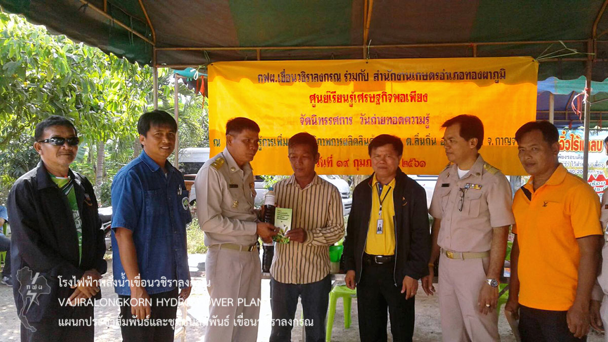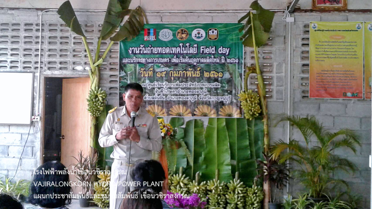 เมื่อวันที่ 19 กุมภาพันธ์ 2561 นายสม ขุมโมกข์ หัวหน้าแผนประชาสัมพันธ์และชุมชนสัมพันธ์ และนายอำนวย เข็มเงิน หัวหน้าแผนกบำรุงรักษาบริเวณ กองบำรุงรักษาโยธา เขื่อนวชิราลงกรณ เป็นตัวแทน ผู้อำนวยการเขื่อนวชิราลงกรณ เข้าร่วมพิธีเปิดงานวันถ่ายทอดเทคโนโลยี (Field day) และบริการทางการเกษตรเพื่อเริ่มต้นฤดูกาลผลิตใหม่ ประจำปี 2561 ณ ศูนย์เรียนรู้การเพิ่มประสิทธิภาพการผลิตสินค้าเกษตร(ศพก.) ตำบลลิ่นถิ่น อำเภอทองผาภูมิ จังหวัดกาญจนบุรี โดยมีนายวันชัย นิลวงศ์ เกษตรจังหวัดกาญจนบุรี เป็นประธาน นายประสาร ปานคง เกษตรอำเภอ เป็นผู้กล่าวรายงาน พร้อมด้วยหัวหน้าส่วนราชการ ทหาร ผู้นำชุมชน ประชาชน เข้าร่วมพิธี และนำเยี่ยมชมฐานเรียนรู้ 5 ฐาน คือ 1.การผลิตกล้วยไข่ส่งออกและบัญชีต้นทุนอาชีพ 2.การผลิตปุ๋ยอินทรีย์และการวิเคราะห์ดินเพื่อใช้ปุ๋ยอย่างถูกต้องและเหมาะสม 3.การใช้สารชีวภัณฑ์ การผลิตและขยายเชื้อไตรโคเดอม่า 4.เศรษฐกิจพอเพียง เกษตรทฤษฎีใหม่และเกษตรผสมผสาน เพื่อให้ความรู้กับผู้เข้าร่วมกิจกรรม