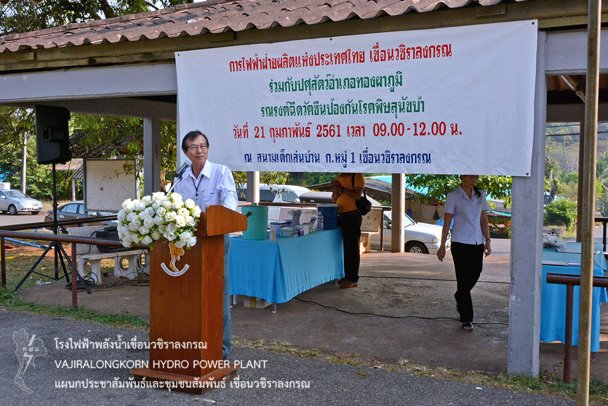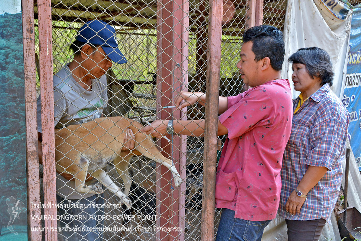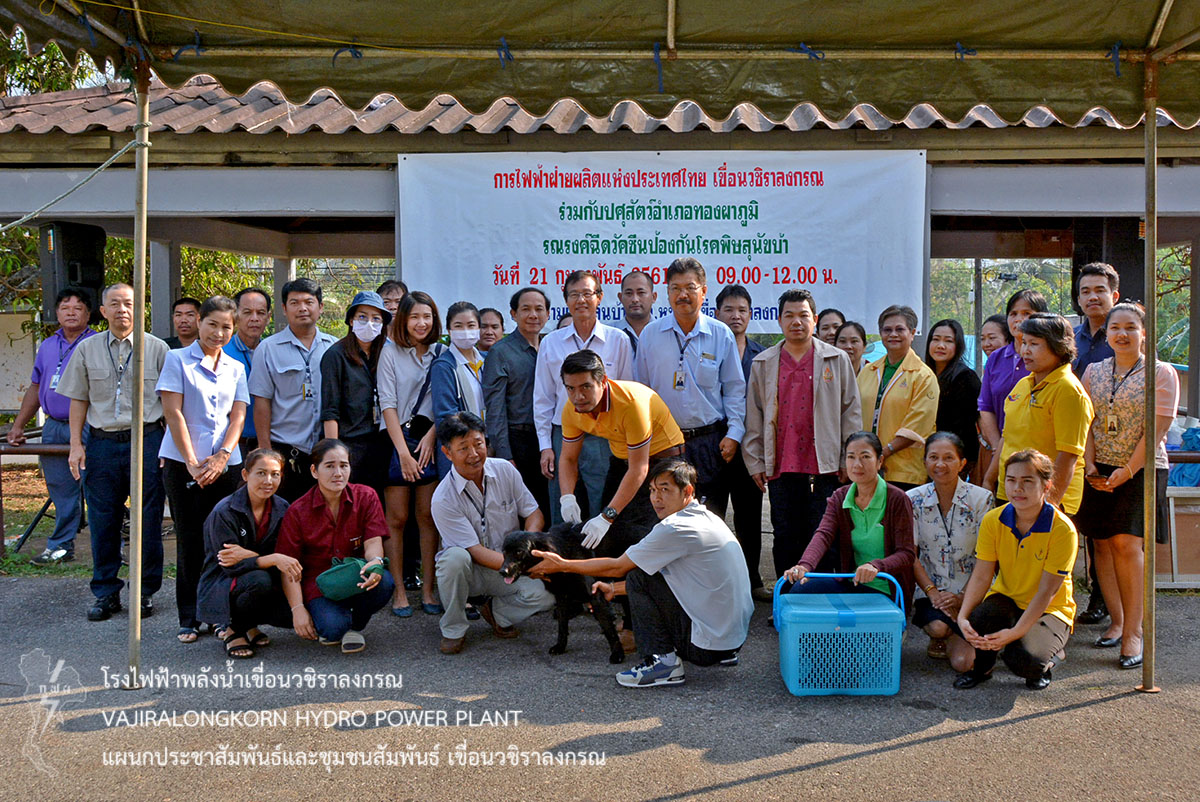 เมื่อวันที่ 21 กุมภาพันธ์ 2561 นายไววิทย์ แสงพานิชย์ ผู้อำนวยการเขื่อนวชิราลงกรณ , นายนภฤทธิ์ ผดุงศรี ผู้ช่วยผู้อำนวยการเขื่อนวชิราลงกรณ-บริหาร, นายภาณุ ทิพย์ภาระ วิทยากรระดับ 10 หัวหน้ากลุ่มงานนันทนาการ เป็นประธานเปิดโครงการ “รณรงค์ฉีดวัคซีนป้องกันโรคพิษสุนัขบ้า และยาคุมกำเนิด ให้กับสัตว์เลี้ยง” โดยเขื่อนวชิราลงกรณร่วมกับปศุสัตว์อำเภอทองผาภูมิ จังหวัดกาญจนบุรี ให้บริการฉีดวัคซีนป้องกันโรคพิษสุนัขบ้า และยาคุมกำเนิด ให้กับสัตว์เลี้ยง เช่น สุนัข และแมว ภายในบริเวณเขื่อนวชิราลงกรณ ณ ศาลาสนามเด็กเล่นบ้านพักหมู่ที่ 1 โดยมีนางภัสภรณ์ หลอดศิริ หัวหน้าแผนกสุขภาพและอนามัย กองบริหารเขื่อนวชิราลงกรณ , พ.จ.อ. อนุรักษ์ สุขมาก พยาบาลปริญญาระดับ 6 และ นางสาวกรกนก วงค์อ๊อด พยาบาลปริญญาระดับ 4 ให้การต้อนรับและประสานงานพร้อมทั้งดูแลตลอดจนดำเนินการเสร็จ