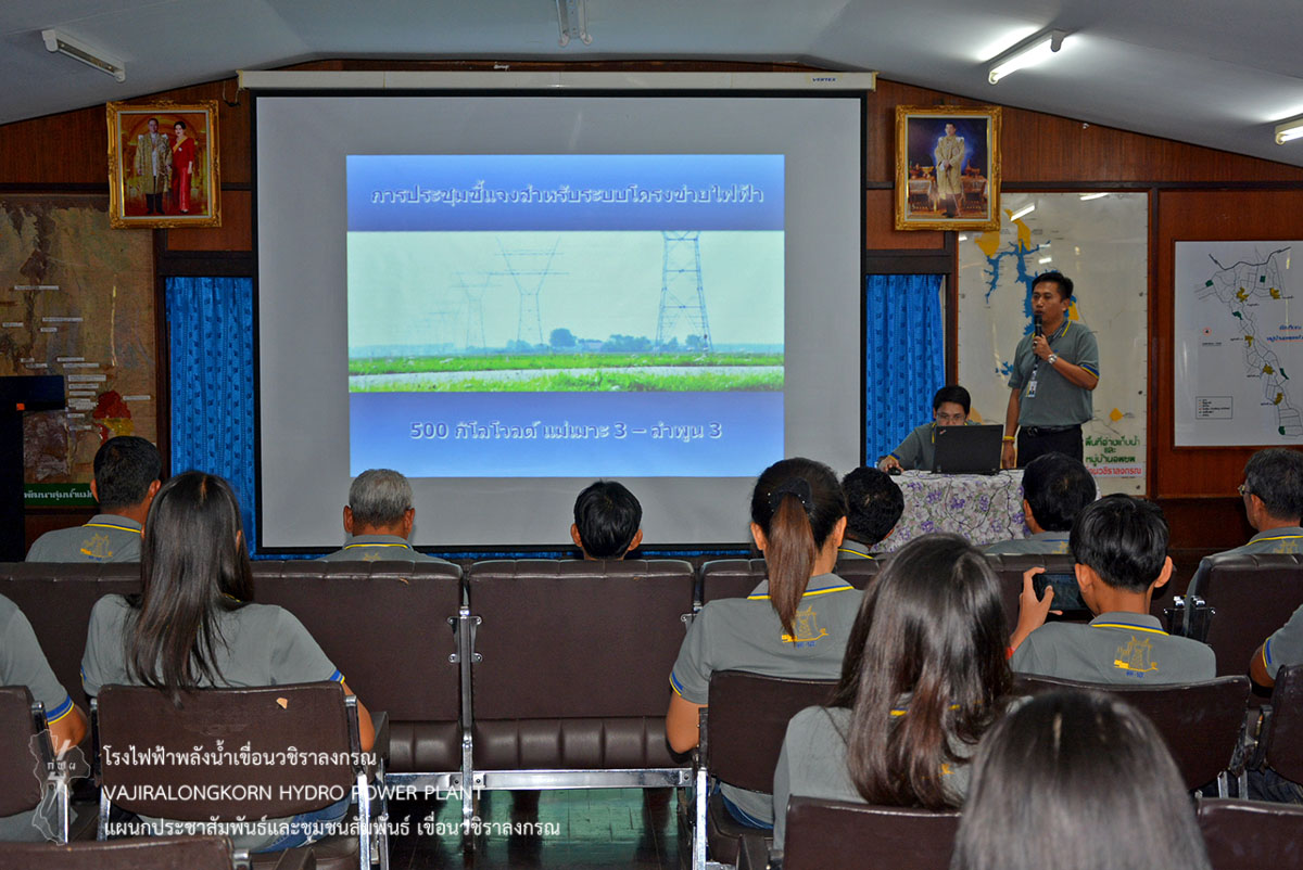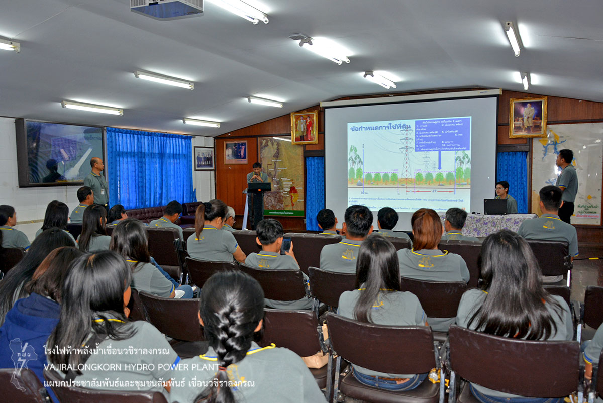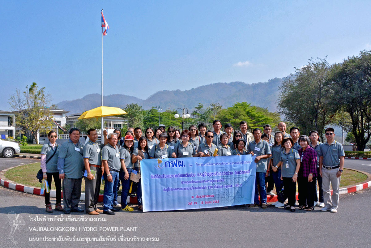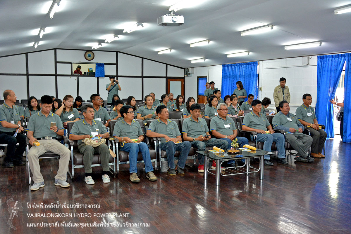 เมื่อวันที่ 14 มีนาคม 2561 นางสาวบาหยัน หวังรวมกลาง พนักงานวิชาชีพระดับ 7 แผนกประชาสัมพันธ์และชุมชนสัมพันธ์ เขื่อนวชิราลงกรณ ให้การต้อนรับ นายศราวุธ สุวรรณจูฑะ นายอำเภอวังม่วงและนายมานะ หร่ายเจริญปลัดอาวุดโส ในโอกาสนำคณะผู้นำชุมชน พื้นที่ใกล้แนวสายส่ง 230 KV อยุธยา 4-สี่คิ้ว 2 อำเภอวังม่วง จังหวัดสระบุรี จำนวน 40 คน ฟังบรรยายประวัติความเป็นมาของเขื่อนวชิราลงกรณ ณ ห้องบรรยายแผนกประชาสัมพันธ์