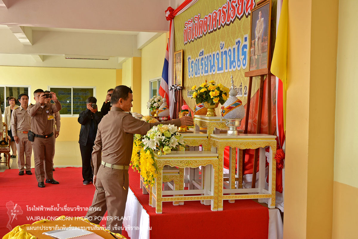 เมื่อวันที่ 28 มีนาคม 2561 นายนภฤทธิ์ ผดุงศรี ผู้ช่วยผู้อำนวยการเขื่อนวชิราลงกรณ-บริหาร นายภาณุ ทิพย์ ภาระ วิทยากรระดับ 10 หัวหน้ากลุ่มงานนันทนาการ และนายสม ขุมโมกข์ หัวหน้าแผนกประชาสัมพันธ์และชุมชนสัมพันธ์เขื่อนวชิราลงกรณ เข้าร่วมพิธีเปิดอาคารเรียนโรงเรียนบ้านไร่ ซึ่งเป็นโรงเรียนในโครงการกองทุนการศึกษาที่ 2 โดยมีพลเอกไพบูลย์ คุ้มฉายา องคมนตรี เป็นประธานในพิธีเปิดงาน พร้อมด้วยหัวหน้าส่วนราชการ ผู้นำส่วนท้องถิ่น รัฐวิสาหกิจ และผู้เกี่ยวข้องเข้าร่วมพิธี ณ เรียนโรงเรียนบ้านไร่ ตำบลห้วยเขย่ง อำเภอทองผาภูมิ จังหวัดกาญจนบุรี
