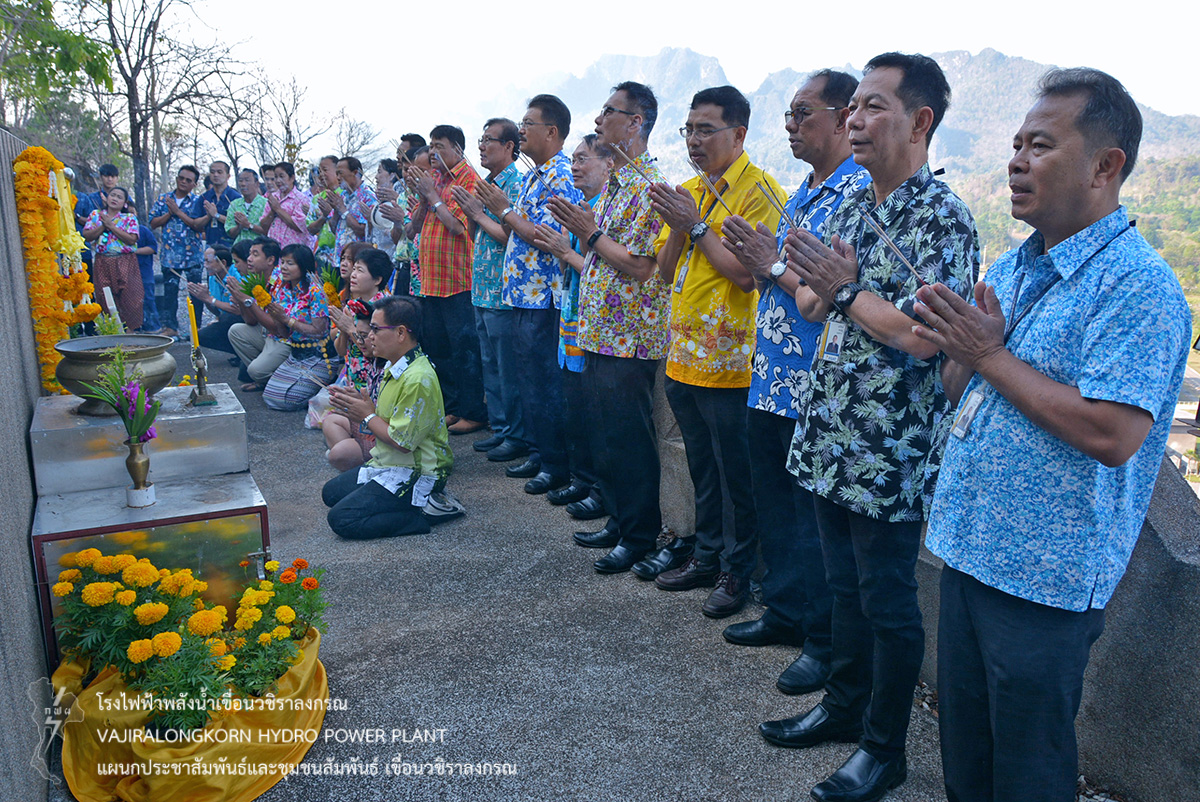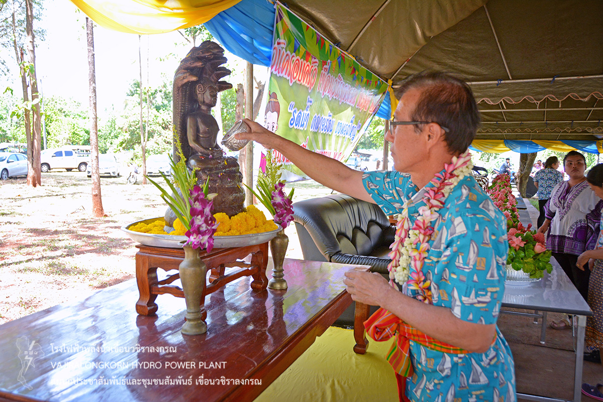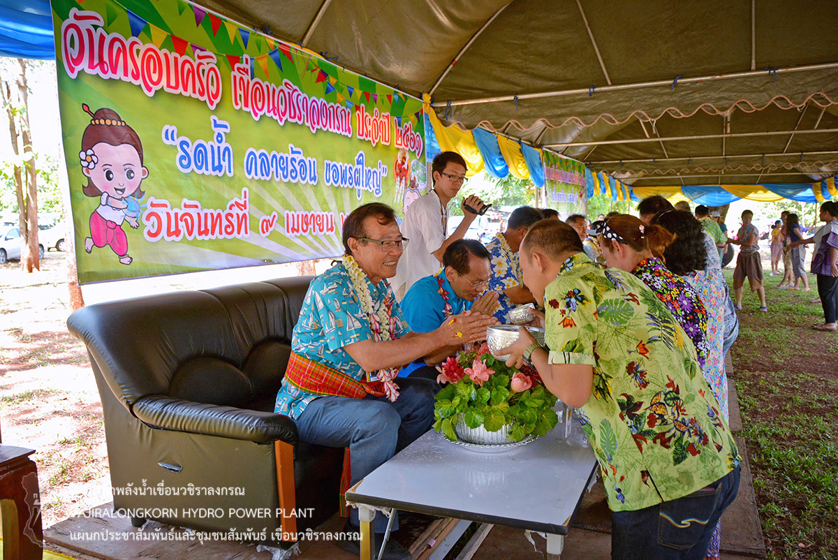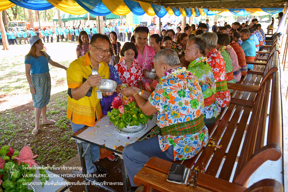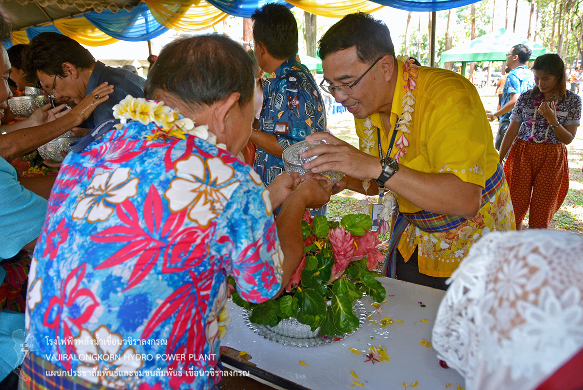 ช่วงพักเที่ยงร่วมกันรับประทานอาหารและเครื่องดื่ม และจัดพิธีรดน้ำขอพรผู้ใหญ่ โดยมีนายไววิทย์ แสงพานิชย์ ผู้อำนวยการเขื่อนวชิราลงกรณ เป็นประธานในพิธีรดน้ำขอพร และมีนายธนสาร ฐานะวุฑฒ์ วิศวกรระดับ 11 เขื่อนวชิราลงกรณ เป็นผู้แทนผู้ปฏิบัติงานกล่าวนำคำขอขมา จากนั้น ผู้อำนวยการเขื่อนวชิราลงกรณ กล่าวขอบคุณคณะผู้จัดกิจกรรม ผู้บริหาร ผู้ปฏิบัติงานเขื่อนวชิราลงกรณ พร้อมทั้งกล่าวอวยพร และเป็นประธานในพิธีสรงน้ำพระพุทธสิริสัตตราช และจัดพิธีรดน้ำขอพรผู้เกษียณอายุเขื่อนวชิราลงกรณ