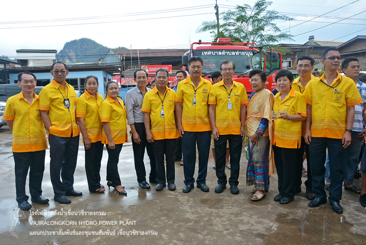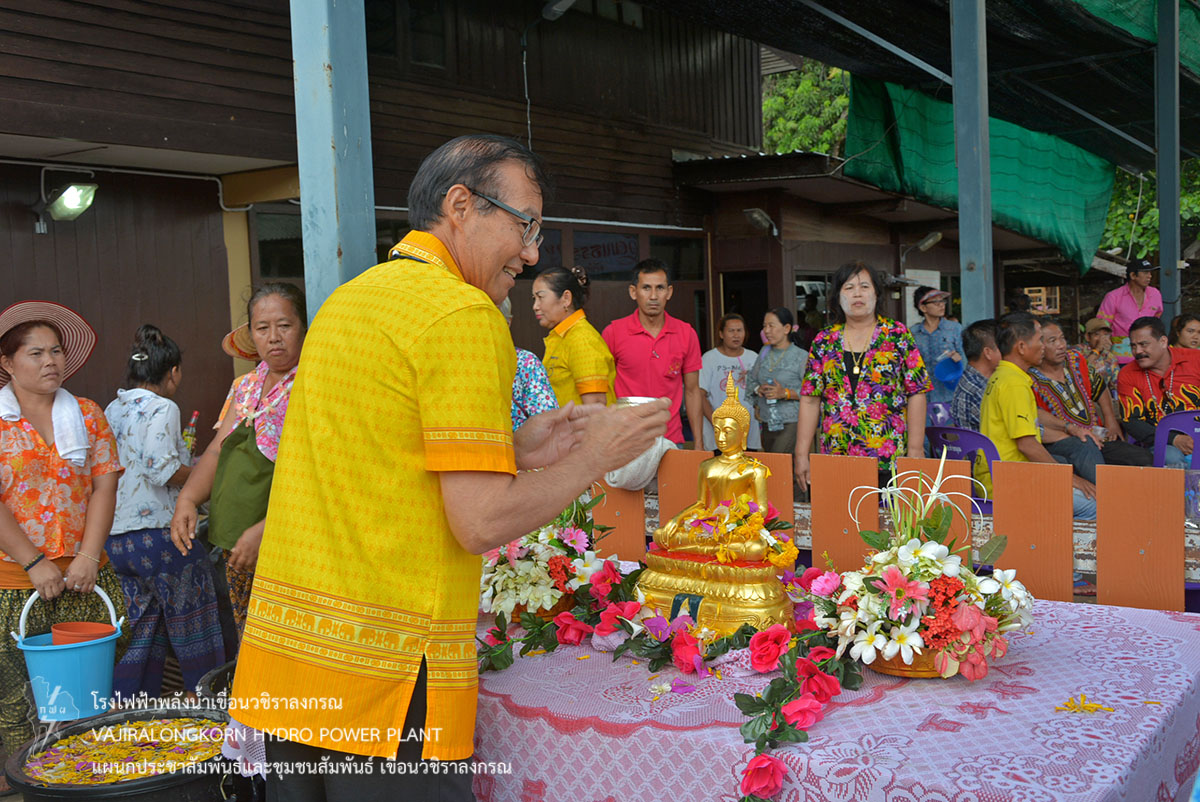 เมื่อวันที่ 17 เมษายน 2561 นายไววิทย์ แสงพานิชย์ ผู้อำนวยการเขื่อนวชิราลงกรณ พร้อมด้วยนายศราวุธ ธนศิลปวิทยา ผู้ช่วยผู้อำนวยการเขื่อนวชิราลงกรณ-ปฏิบัติการ นายนภฤทธิ์ ผดุงศรี ผู้ช่วยผู้อำนวยการเขื่อนวชิราลงกรณ-บริหาร นายธนสาร ฐานะวุฒฑ์ วิศวกรระดับ 11 เขื่อนวชิราลงกรณ นายสุรพล กองแก้ว หัวหน้ากองบริหาร และผู้ปฏิบัติงานเขื่อนวชิราลงกรณ เข้าร่วมรดน้ำขอพรให้กับนายจิรชัย ถนอมวงษ์ นายกเทศมนตรีตำบลท่าขนุน เพื่อเป็นการสืบสานประเพณีไทยและความเป็นสิริมงคลเนื่องในโอกาสวันขึ้นปีใหม่ไทย หรือเทศกาลสงกรานต์ ณ บ้านถนอมวงษ์ อำเภอทองผาภูมิ จังหวัดกาญจนบุรี