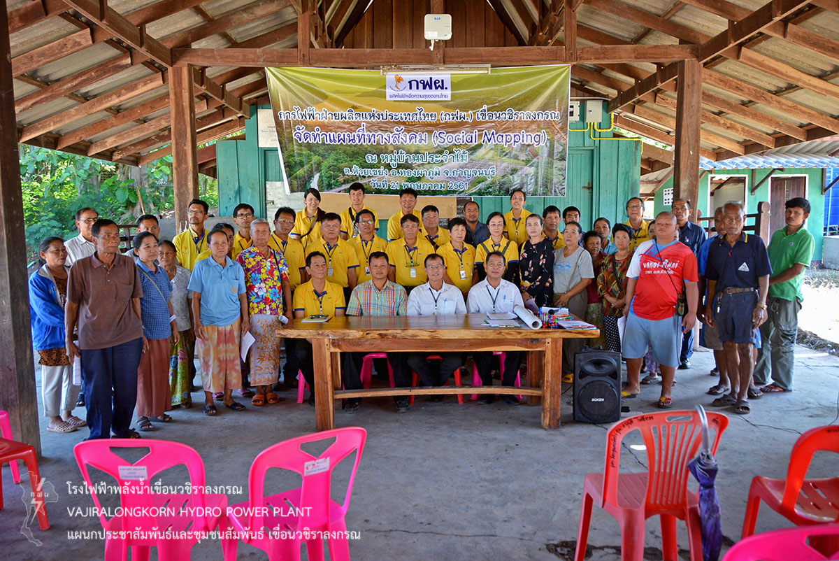เมื่อวันที่ 21 พฤษภาคม 2561 นายไววิทย์ แสงพานิชย์ ผู้อำนวยการเขื่อนวชิราลงกรณ เป็นประธานเปิดการจัดทำโครงการพัฒนาศักยภาพการจัดทำแผนที่ทางสังคม (Social Mapping) หมู่บ้านประจำไม้ ณ ศาลาประชาคมหมู่บ้านประจำไม้ หมู่ที่ 4 ตำบลห้วยเขย่ง อำเภอทองผาภูมิ จังหวัดกาญจนบุรี โดยมี นายสุรพล กองแก้ว หัวหน้ากองบริหาร นายอภิรักษ์ ทองโต หัวหน้ากองบำรุงรักษาโรงไฟฟ้า พร้อมคณะทำงานโครงการชีววิถีเพื่อการพัฒนาอย่างยั่งยืนเขื่อนวชิราลงกรณ และนายสมชาย ปัญญาทูล ผู้ใหญ่บ้าน บ้านประจำไม้ ชุมชนบ้านประจำไม้ จำนวน 30 คน เข้าร่วมการจัดทำแผนที่ทางสังคมหมู่บ้านประจำไม้ โดยมีนายอภิชาย กระต่ายเพ็ชร์ หัวหน้าแผนกธุรการและบริการ เป็นวิทยากรกระบวนการ และนายสม ขุมโมกข์ หัวหน้าแผนกประชาสัมพันธ์และชุมชนสัมพันธ์ เป็นผู้ประสานงาน โดยมีการแบ่งกลุ่มผู้รู้เพื่อให้ข้อมูลและผู้บันทึกข้อมูล ประกอบด้วย กลุ่มการจัดทำแผนที่เดินดิน ผังองค์กรชุมชน ประวัติศาสตร์ชุมชน ปฏิทินชุมชน และปราชญ์ชุมชน ทำการสำรวจพื้นที่เดินดิน การสัมภาษณ์ เพื่อดึงข้อมูลและประสบการณ์ ของผู้เข้าร่วมกิจกรรมให้เกิดการแลกเปลี่ยน และทำการจดบันทึกข้อมูลลงในกระดาษ พร้อมกับจัดนำเสนอรายงานของแต่ละกลุ่ม เพื่อนำมาจัดทำเป็นรูปเล่มสำหรับมอบให้บ้านประจำไม้ต่อไป