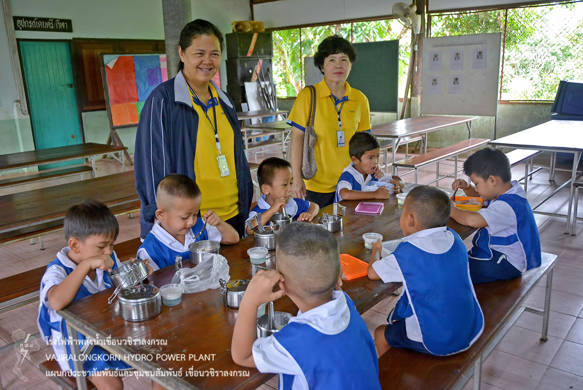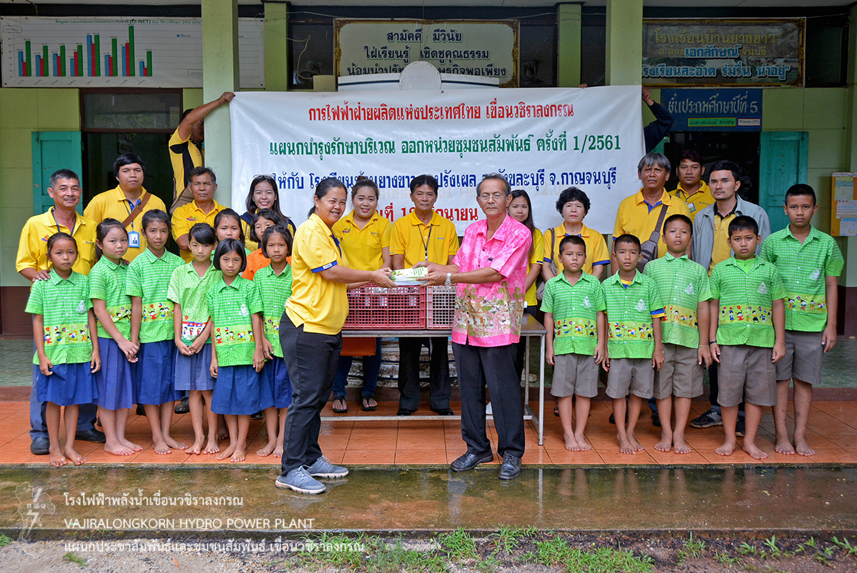 เมื่อวันที่ 12 มิถุนายน2561น.ส.บุญนาค ตรีสาครพนักงานวิชาชีพระดับ 8แผนกบำรุงรักษาบริเวณกองบำรุงรักษาโยธานำผู้ปฏิบัติงาน ลูกจ้างจัดออกหน่วยโครงการชุมชนสัมพันธ์ และจัดโครงการเสริมสร้างสัมพันธภาพชุมชนรอบเขื่อนวชิราลงกรณ ณ โรงเรียนบ้านยางขาวตำบลปรังเผล อำเภอสังขละบุรี จังหวัดกาญจนบุรีโดยมอบน้ำยา EM และมอบเงินสมทบทุนอาหารกลางวันเด็กนักเรียนและสมทบทุนการศึกษา จำนวน 4,000บาทให้กับนายธานินทร์ อุ่นใจผู้อำนวยการโรงเรียนบ้านยางขาวพร้อมคณะครูและนักเรียน เป็นผู้รับมอบสำหรับไว้ใช้ในภารกิจของโรงเรียน