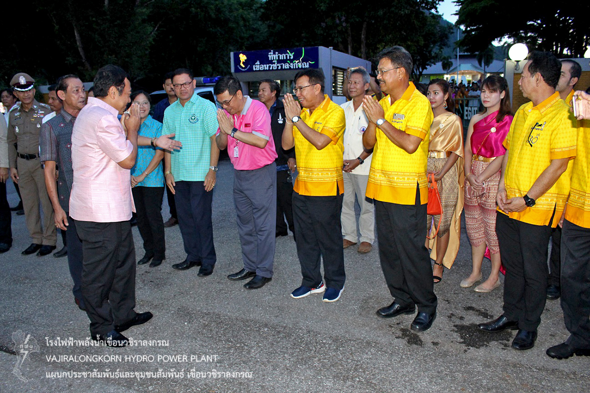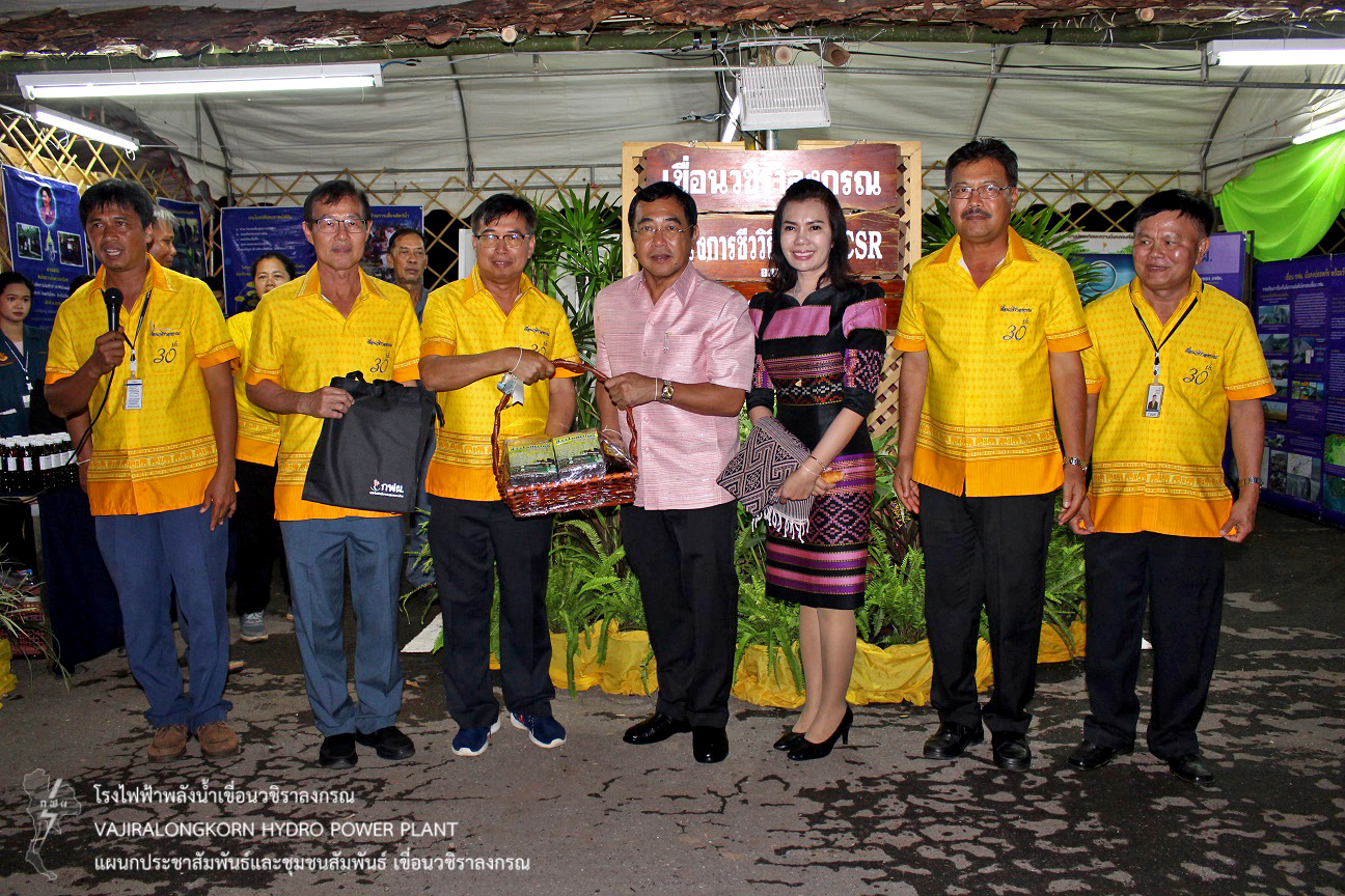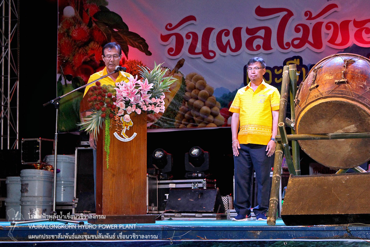 นายไววิทย์ แสงพานิชย์ ผู้อำนวยการเขื่อนวชิราลงกรณ (อขว.) กล่าวว่า “ กฟผ.เขื่อนวชิราลงกรณ ยินดีต้อนรับทุกท่านด้วยความยินดียิ่ง และขอขอบคุณที่ให้ความไว้วางใจใช้สถานที่เขื่อนจัดกิจกรรมในครั้งนี้ และขอเรียนว่าเขื่อนวชิราลงกรณนั้น มีความมั่นคงแข็งแรง เอื้อประโยชน์ในด้านการชลประทาน ด้านการอุปโภคและบริโภคเป็นประโยชน์ต่อพี่น้องประชาชน ช่วยป้องกันอุทกภัย รักษาระบบนิเวศน์ และผลพลอยได้ด้านพลังงานไฟฟ้าและมีความพร้อมที่ให้ความร่วมมือกับทุกภาคส่วนในการทำกิจกรรมเพื่อชุมชนและส่วนรวมโดยเฉพาะอย่างยิ่งการจัดงานวันผลไม้ของดีอำเภอทองผาภูมิและสืบสานประเพณีลานบ้านลานวัฒนธรรม ประจำปี 2561 ซึ่งเป็นการส่งเสริมการท่องเที่ยวของอำเภอทองผาภูมิ ”