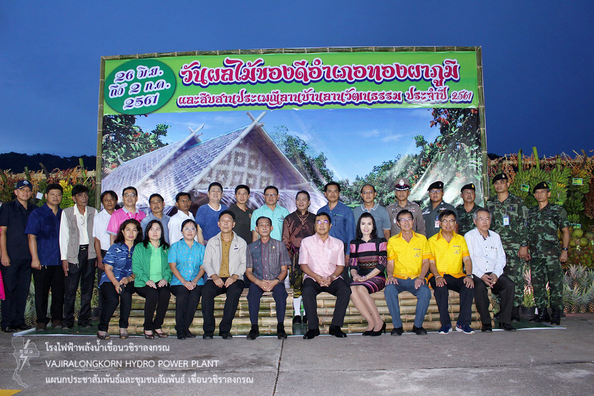 การไฟฟ้าฝ่ายผลิตแห่งประเทศไทย เขื่อนวชิราลงกรณ ร่วมกับอำเภอทองผาภูมิ เกษตรจังหวัดกาญจนบุรี เทศบาลตำบลทองผาภูมิ องค์กรปกครองส่วนท้องถิ่น ผู้ประกอบการผลผลิตทางการเกษตร และการท่องเที่ยวในพื้นที่อำเภอทองผาภูมิ ร่วมกันจัดงาน “วันผลไม้ของดีอำเภอทองผาภูมิและสืบสานประเพณีลานบ้านลานวัฒนธรรม” พร้อมจัดแสดงวิถีชีวิตของชนเผ่า ได้แก่ ชาวไทยอีสาน กระเหรี่ยง มอญ ม้ง-เย้า การแสดงแสง สี เสียง “ชุดทองผาภูมิรวมใจ ถวายพระพรชัยสมเด็จพระเจ้าอยู่หัวมหาวชิราลงกรณ บดินทรเทพยวรางกูร” และการจำหน่ายผลิตผลทางการเกษตร / สินค้าอุปโภคและบริโภค การประกวดสาวงามทองผาภูมิ การประกวดขบวนรถผลไม้ การจัดนิทรรศการของหน่วยงานราชการ รัฐวิสาหกิจและเอกชน จัดงานตั้งแต่วันที่ 26 มิถุนายน – 2 กรกฎาคม 2561 ณ เขื่อนวชิราลงกรณ อำเภอทองผาภูมิ จังหวัดกาญจนบุรี เพื่อเป็นการส่งเสริมการท่องเที่ยวในเชิงอนุรักษ์และสร้างความเชื่อมั่น เขื่อน กฟผ. มีความมั่นคงแข็งแรงและปลอดภัย
