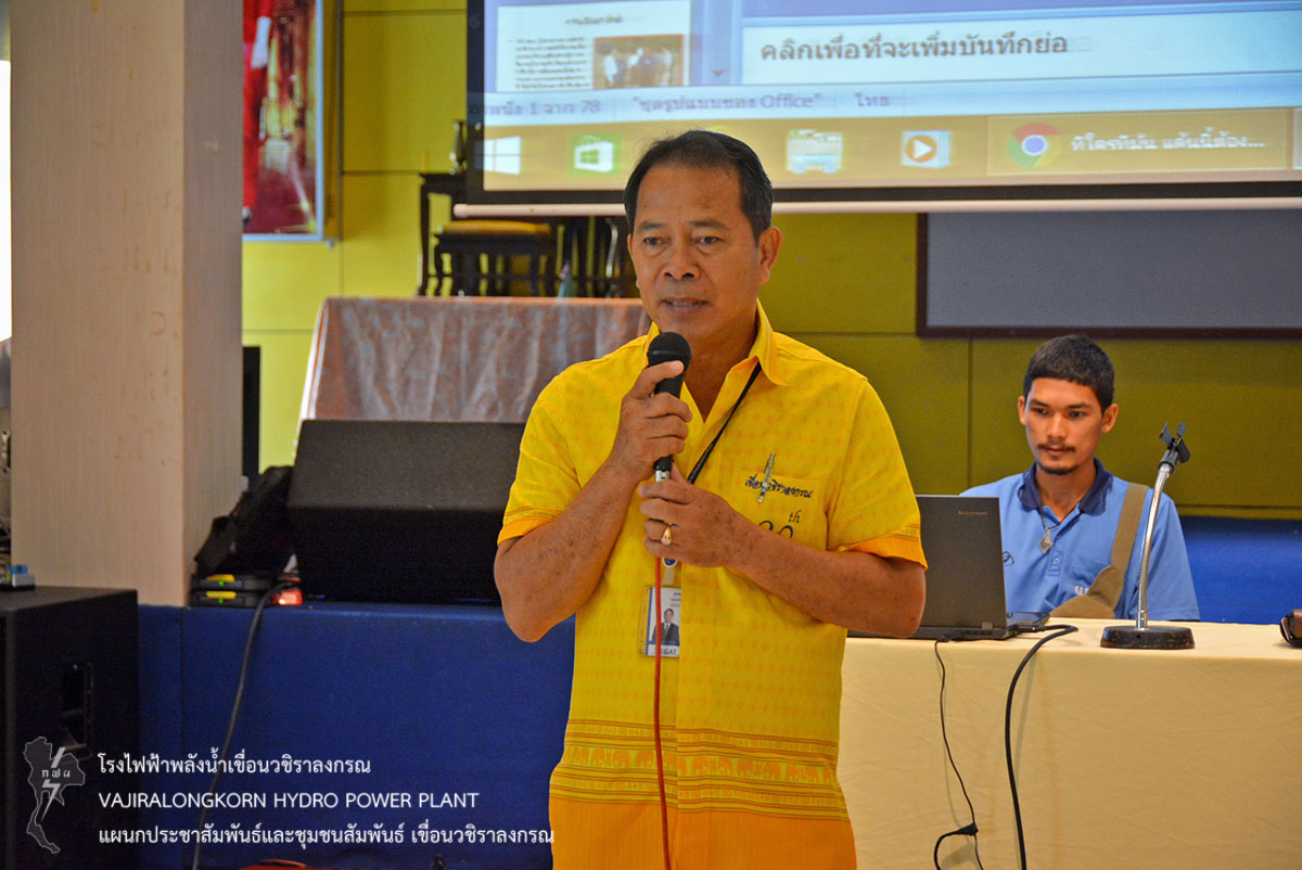 เมื่อวันที่ 4 กรกฏาคม 2561 นายสุรพล กองแก้ว หัวหน้ากองบริหาร และนางสาวอริยา เหมือนใจ วิทยากรระดับ 5 แผนกประชาสัมพันธ์และชุมชนสัมพันธ์ เขื่อนวชิราลงกรณ ให้การต้อนรับนางสาวสมฤทัย พาที หัวหน้ากลุ่มสาระการเรียนรู้วิทยาศาสตร์ ในโอกาสนำคณะนักเรียนและข้าราชการครู โรงเรียนร่มเกล้า กาญจนบุรี ตำบลลิ่นถิ่นอำเภอทองผาภูมิ จังหวัดกาญจนบุรี จำนวน 107 คน ฟังบรรยายประวัติความเป็นมาของเขื่อนวชิราลงกรณและโครงการชีววิถี ณ อาคารภูมิสุวรรณ