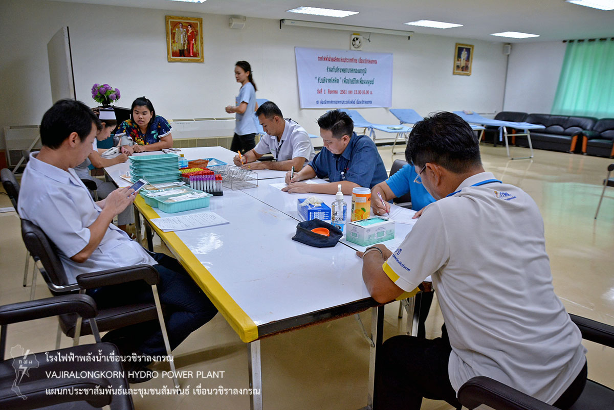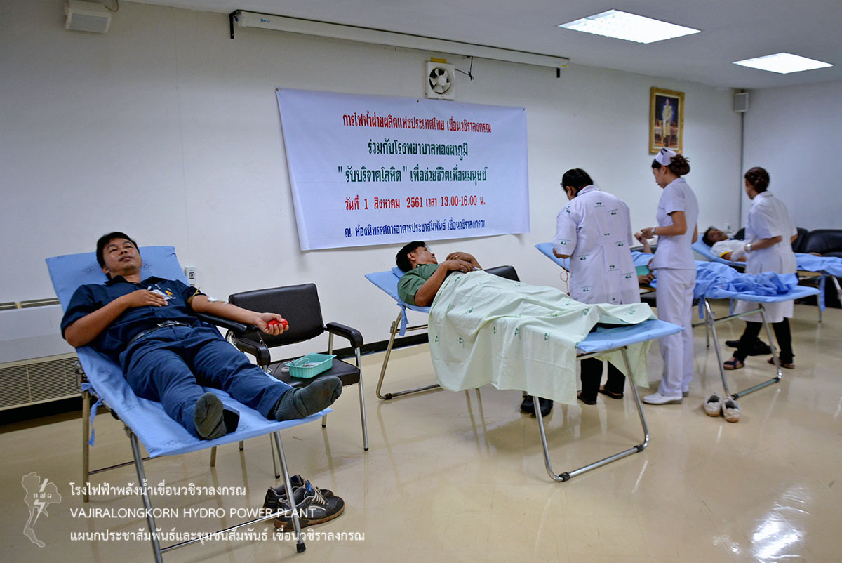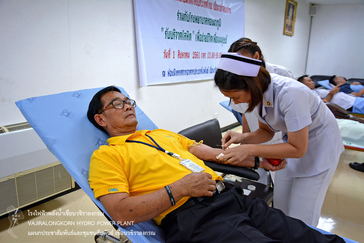 เมื่อวันที่ 1 สิงหาคม 2561 นายศราวุธ ธนศิลปวิทยา ผู้ช่วยผู้อำนวยการเขื่อนวชิราลงกรณ-ปฏิบัติการนางภัสภรณ์ หลอดศิริ หัวหน้าแผนกสุขภาพและอนามัย กองบริหาร เขื่อนวชิราลงกรณ ร่วมกับโรงพยาบาลทองผาภูมิ รับบริจาคโลหิต ณ ห้องนิทรรศการแผนกประชาสัมพันธ์และชุมชนสัมพันธ์ เขื่อนวชิราลงกรณ โดยมีผู้ปฏิบัติงาน และลูกจ้างเหมา เขื่อนวชิราลงกรณ ร่วมกันบริจาคโลหิต จำนวน 29 คน ปริมาณ 8,700 ซีซี ซึ่งโรงพยาบาลทองผาภูมิ จะนำไปช่วยเหลือผู้ป่วยที่ต้องการเลือด และเก็บไว้ใช้ในยามฉุกเฉินต่อไป
