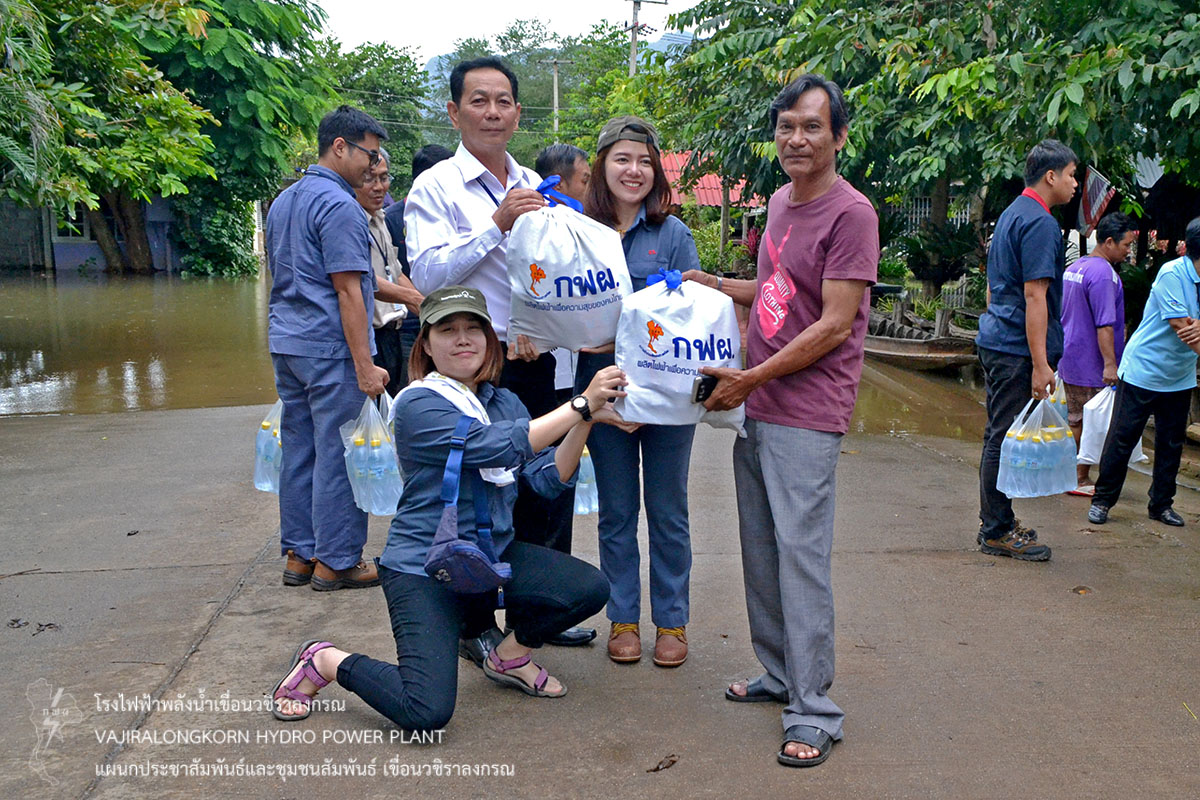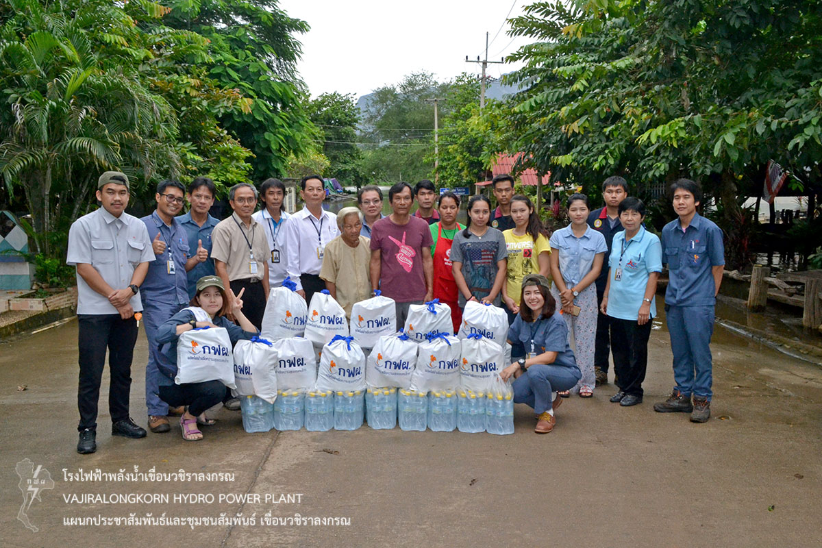 วันที่ 28 สิงหาคม 2561 นายอภิรักษ์ ทองโต กองบำรุงรักษาโรงไฟฟ้าเขื่อนวชิราลงกรณ และผู้ปฏิบัติงานเขื่อนวชิราลงกรณ ร่วมกันมอบถุงยังชีพและน้ำดื่ม น้ำใจ กฟผ. เขื่อนวชิราลกรณ ให้กับชุมชนหมู่บ้านหาดงิ้ว ตำบล วังกระแจะ อำเภอไทรโยค จังหวัดกาญจนบุรี ที่ได้รับผลกระทบจากน้ำป่าไหลหลาก ท่วมบ้านเรือนประชาชน