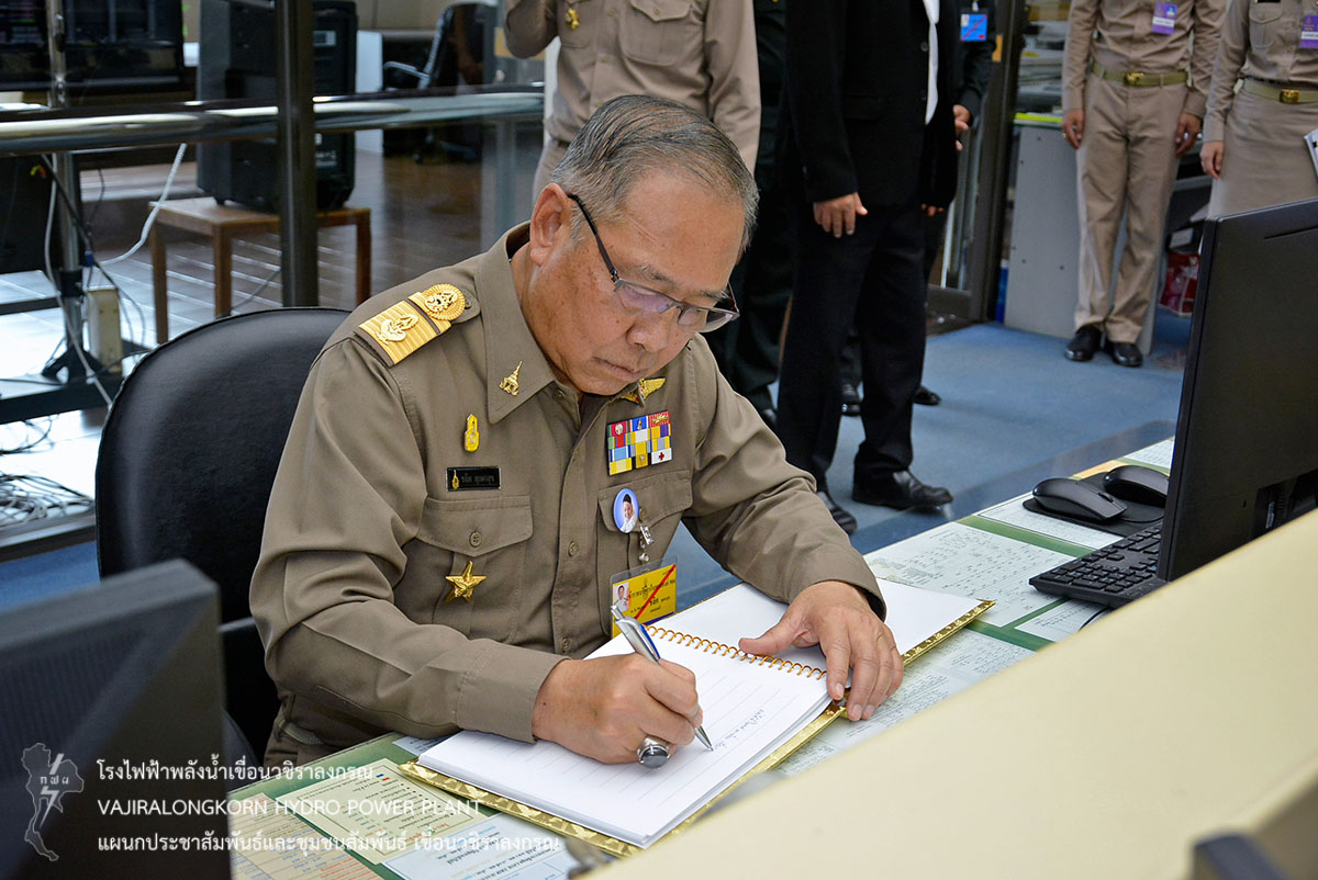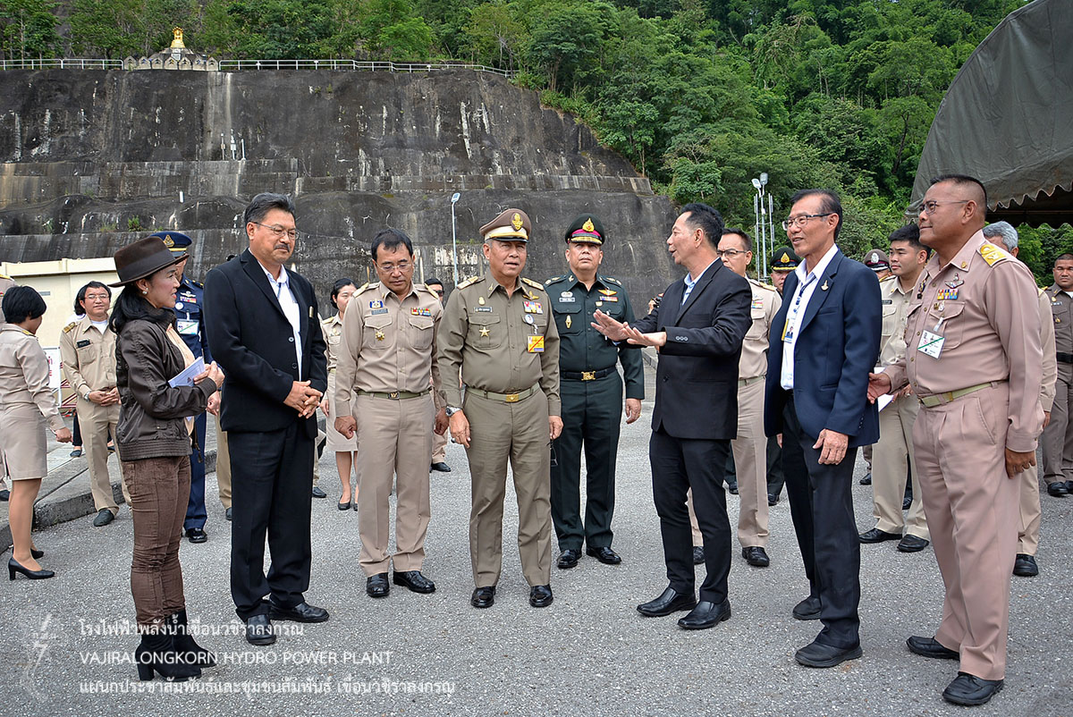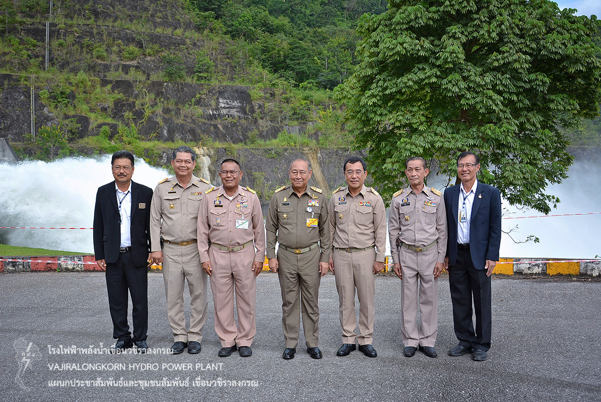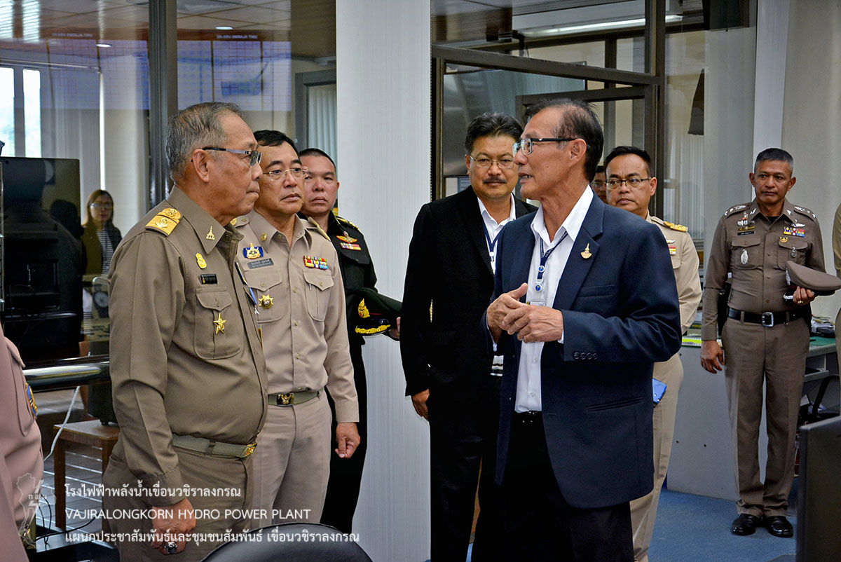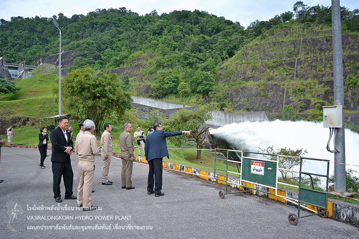 จากนั้นเดินทางไปสังเกตการณ์ระดับน้ำบริเวณสันเขื่อน และบานประตูระบายน้ำ (spillway) พร้อมทั้งเข้าเยี่ยมชมห้องควบคุมการผลิตกระแสไฟฟ้า โดยมี อขว. รายงานถึงสถานการณ์น้ำในอ่างเก็บน้ำ บรรยายขั้นตอนการผลิตกระแสไฟฟ้า พร้อมยืนยันความมั่นคงแข็งแรงของเขื่อนวชิราลงกรณ