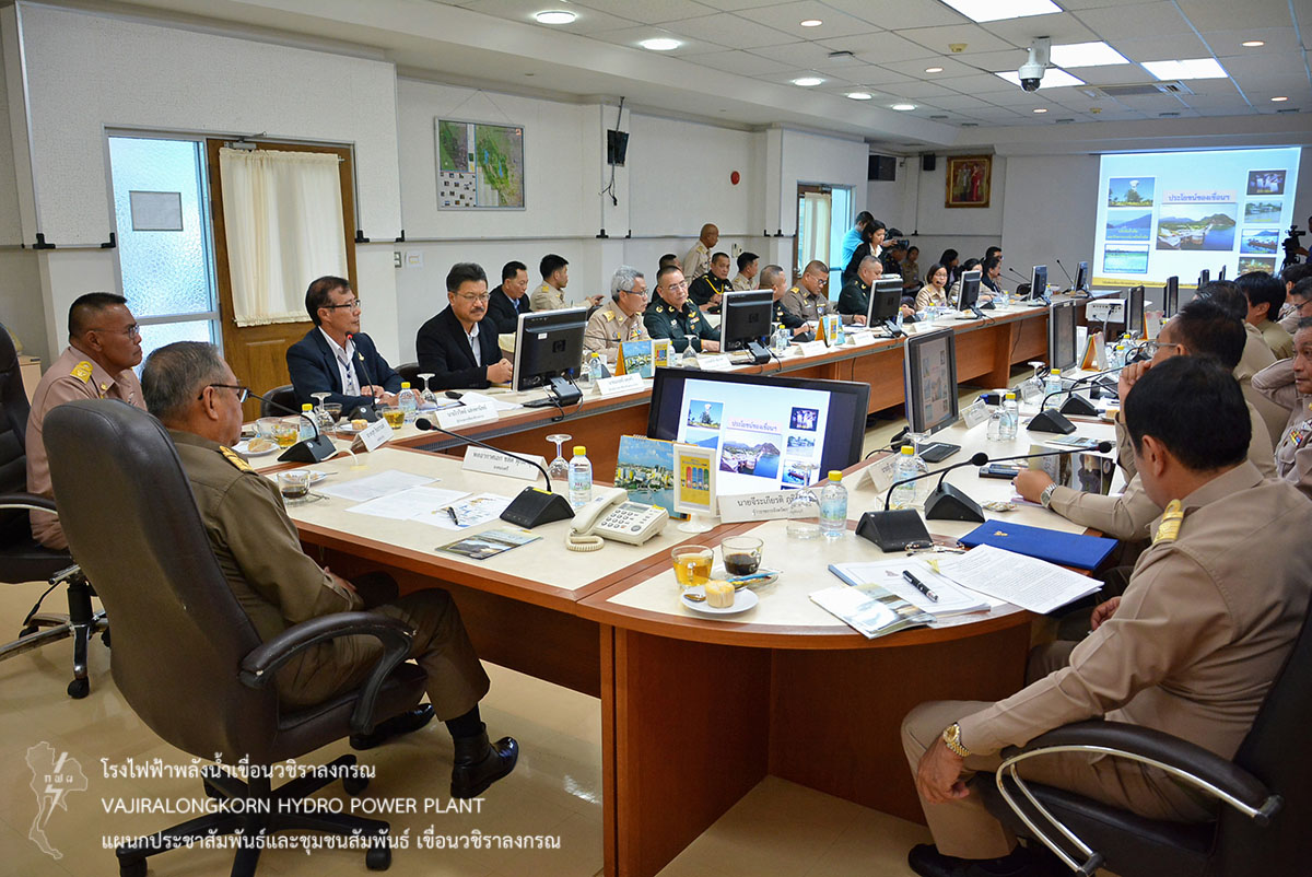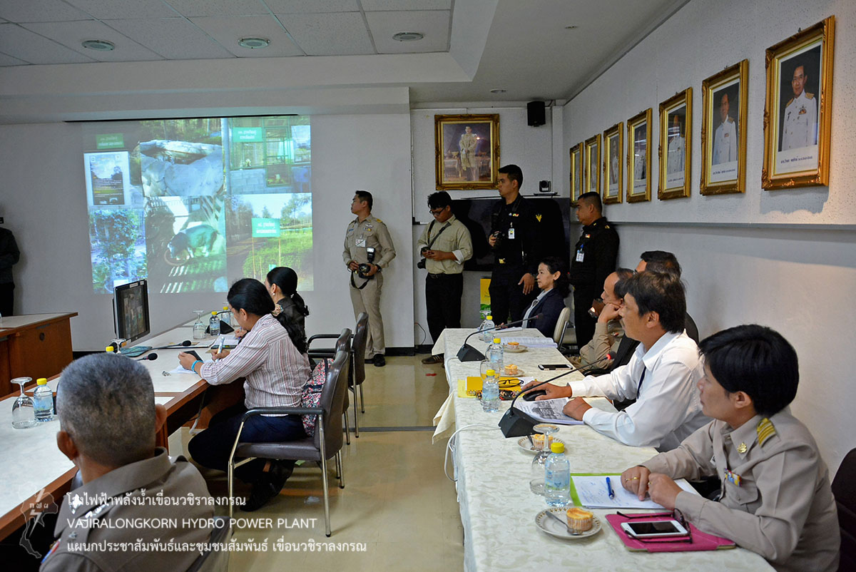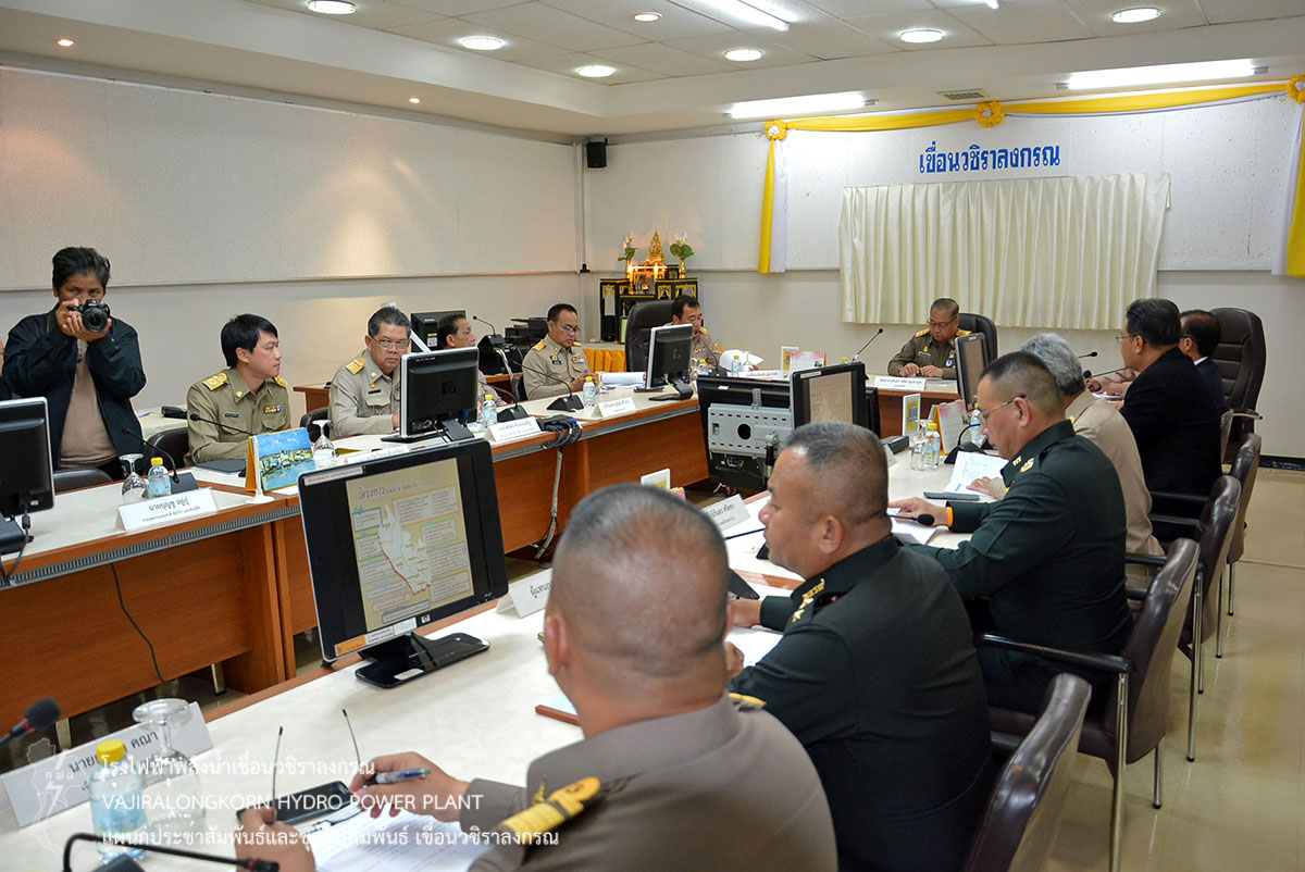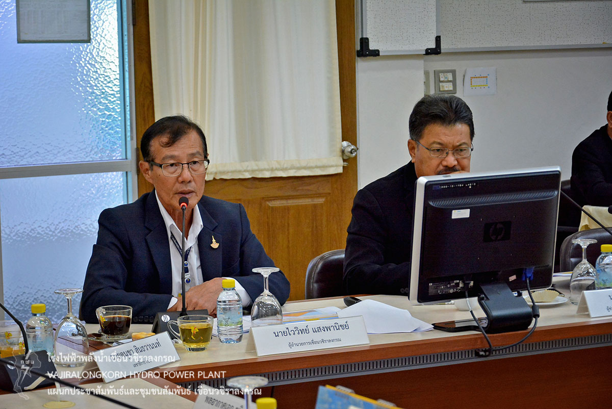 ในการนี้ องคมนตรีและคณะ ได้เดินทางไปยังห้องประชุมเขาแหลม 1 ที่ทำการเขื่อนวชิราลงกรณ โดยมีนายจีระเกียรติ ภูมิสวัสดิ์ ผู้ว่าราชการจังหวัดกาญจนบุรี รายงานการดำเนินงานโครงการอันเนื่องมาจากพระราชดำริในจังหวัดกาญจนบุรี นายไววิทย์ แสงพานิชย์ ผู้อำนวยการเขื่อนวชิราลงกรณ (อขว.) รายงานสถานการณ์และการบริหารจัดการน้ำของเขื่อนวชิราลงกรณ รวมถึงการดำเนินการโครงการชีววิถีเพื่อการพัฒนาอย่างยืน และโครงการ อพ.สธ.ของเขื่อนวชิราลงกรณ พร้อมด้วยนายไพรัตน์ ทับประเสริฐ ผู้อำนวยการส่วนบริหารจัดการน้ำและบำรุงรักษา สำนักชลประทานที่ 13 รายงานการบริหารจัดการน้ำของกรมชลประทาน