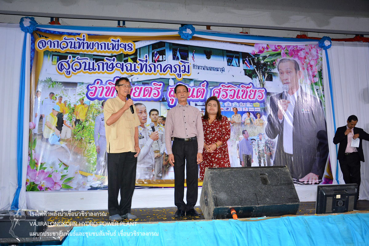 เมื่อวันที่ 21 กันยายน 2561 นายไววิทย์ แสงพานิชย์ ผู้อำนวยการเขื่อนวชิราลงกรณ พร้อมด้วยผู้บริหารและผู้ปฏิบัติงาน เขื่อนวชิราลงกรณ เข้าร่วมงานเลี้ยงเกษียณอายุราชการ ว่าที่ร้อยตรีสุจินต์ ศรีวิเชียร นายอำเภอทองผาภูมิ ณ หอประชุมเขื่อนวชิราลงกรณ โดยมีหน่วยงานราชการ ผู้นำชุมชน เข้าร่วมแสดงความยินดีเป็นจำนวนมาก เพื่อแสดงมุทิตาจิตพร้อมมอบของขวัญที่ระลึกแก่นายอำเภอ รวมทั้งเป็นการสร้างความสัมพันธ์อันดีระหว่าง กฟผ. เขื่อนวชิราลงกรณ และหน่วยงานราชการในพื้นที่ใกล้เคียงเขื่อนวชิราลงกรณ