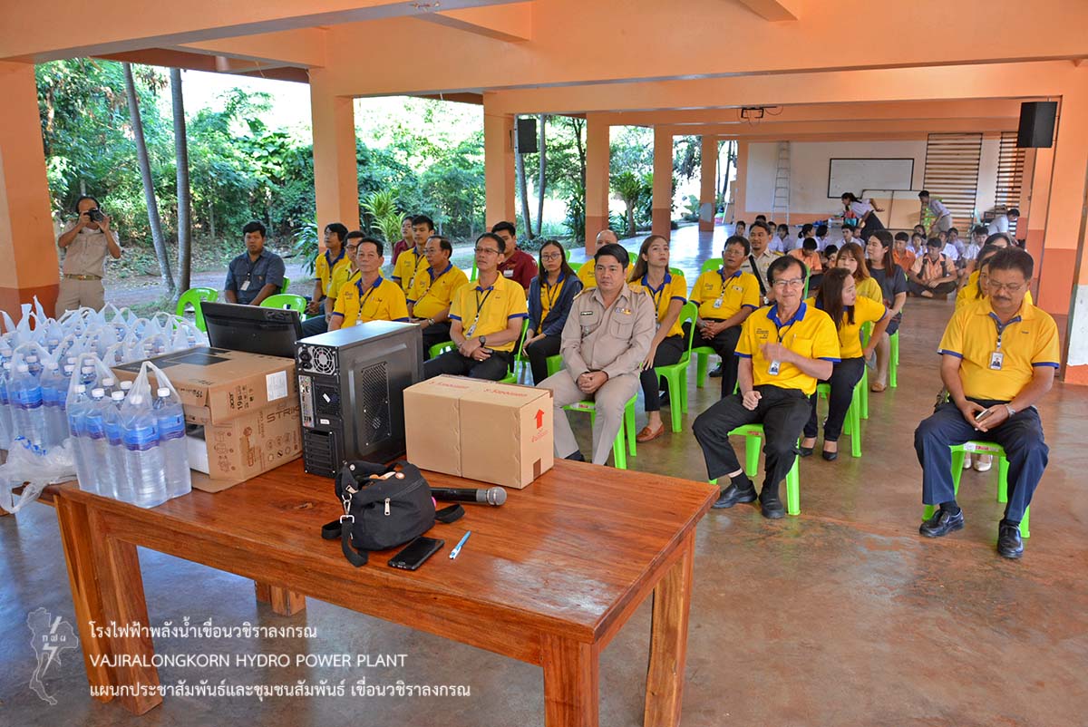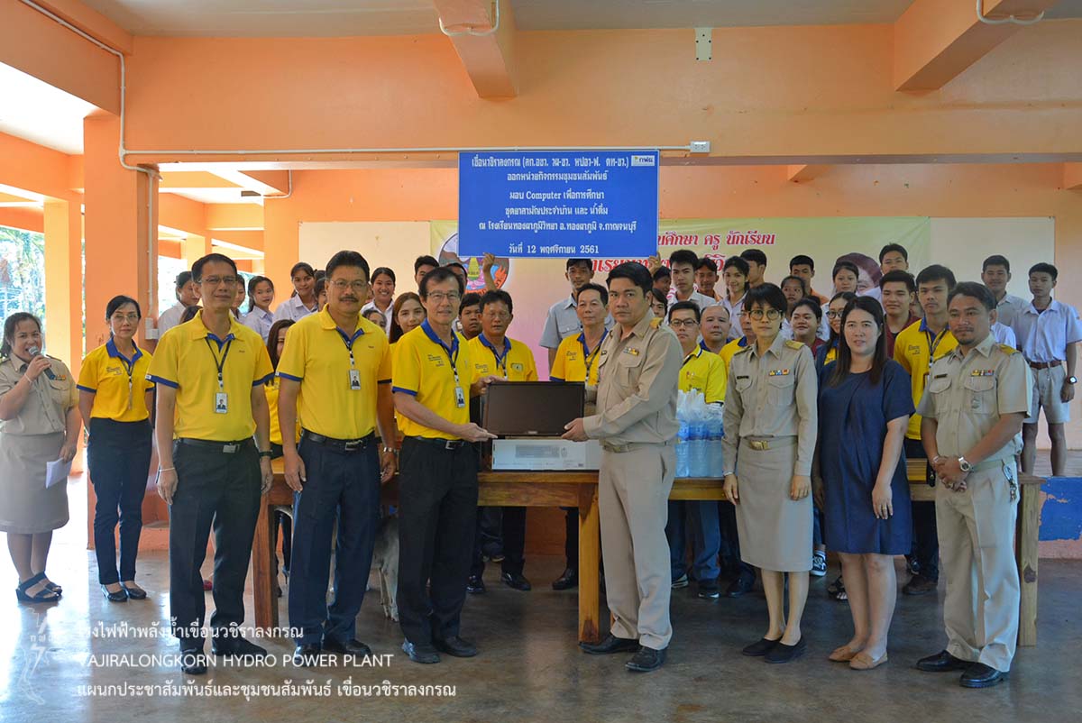 เมื่อวันที่ 12 พฤศจิกายน 2561 นายไววิทย์ แสงพานิชย์ ผู้อำนวยการเขื่อนวชิราลงกรณ พร้อมด้วยผู้ปฏิบัติงานส่วนกลางเขื่อนวชิราลงกรณ จัดออกหน่วยโครงการชุมชนสัมพันธ์และโครงการเสริมสร้างสัมพันธภาพชุมชนรอบเขื่อนวชิราลงกรณ ณ โรงเรียนทองผาภูมิวิทยา ตำบลท่าขนุน อำเภอทองผาภูมิ จังหวัดกาญจนบุรี โดยมอบคอมพิวเตอร์ น้ำดื่มทิพย์แควน้อย และยาสามัญประจำบ้าน เพื่อเป็นการยกระดับสัมพันธภาพที่ดีต่อกัน รวมทั้งเสริมสร้างโอกาสทางการศึกษาให้แก่นักเรียน โดยมีนายยงยุทธ สงพะโยม ผู้อำนวยการโรงเรียนทองผาภูมิวิทยา คณะครูและนักเรียน เป็นผู้รับมอบสำหรับไว้ใช้ในภารกิจการเรียนการสอนของโรงเรียนต่อไป