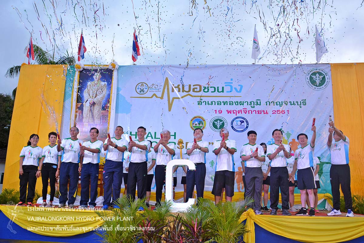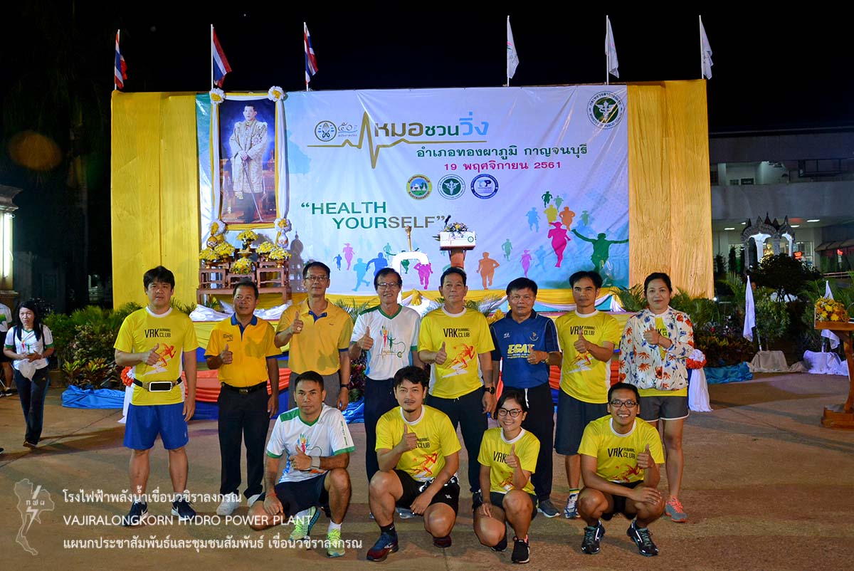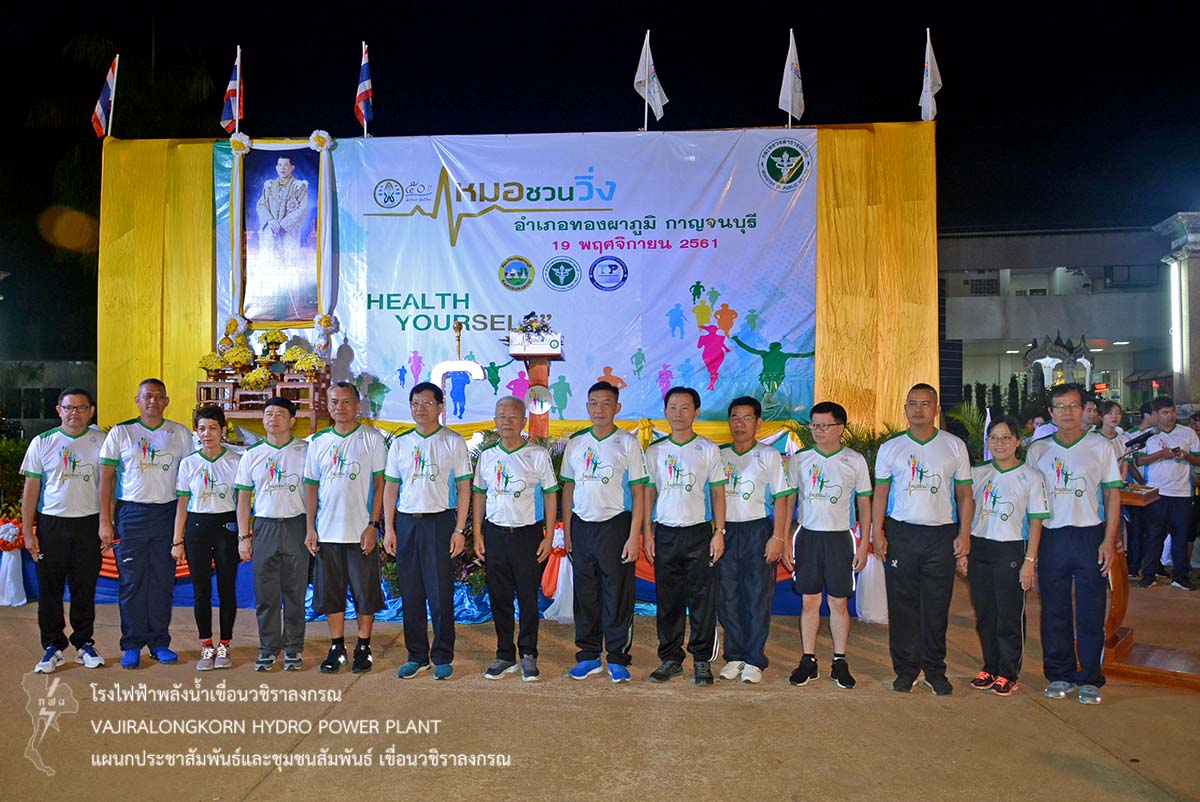 เมื่อวันที่ 19 พฤศจิกายน 2561 นายไววิทย์ แสงพานิชย์ ผู้อำนวยการเขื่อนวชิราลงกรณ นายธนสาร ฐานะวุฒฑ์ ผู้ช่วยผู้อำนวยการเขื่อนวชิราลงกรณ 2 นายอภิรักษ์ ทองโต วิศวกรระดับ11 พร้อมด้วยผู้บริหารและผู้ปฏิบัติงานเขื่อนวชิราลงกรณ ชมรมเดินวิ่งเขื่อนวชิราลงกรณ เข้าร่วมกิจกรรม "หมอชวนวิ่ง" เพื่อสร้างความร่วมมือระหว่างภาครัฐ เอกชนและประชาชน ในรูปแบบเสริมสร้างสุขภาพด้วยการออกกำลังกาย สร้างความตระหนักให้เห็นถึงความสำคัญในการดูแลสุขภาพของตนเอง ณ โรงพยาบาลทองผาภูมิ