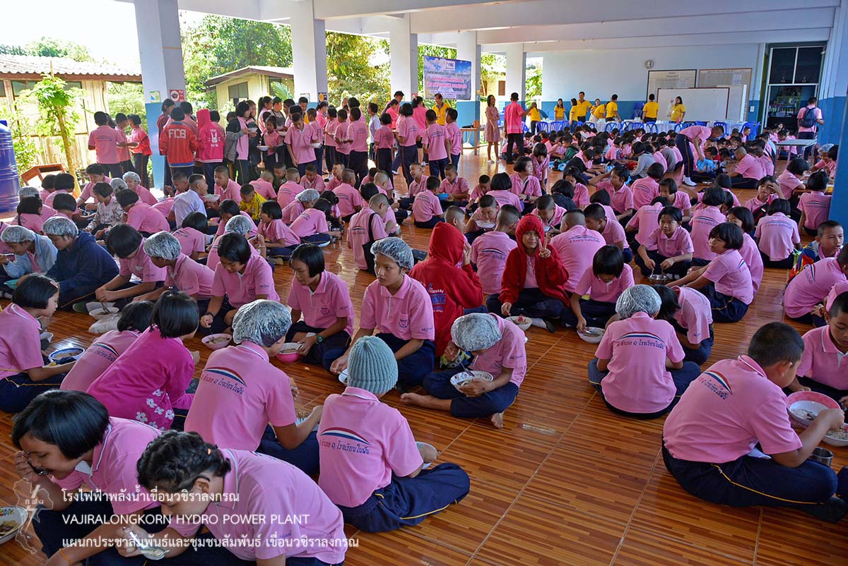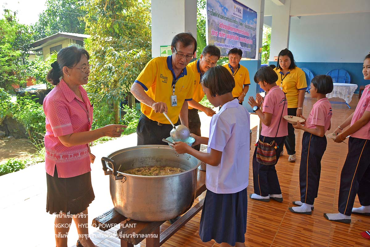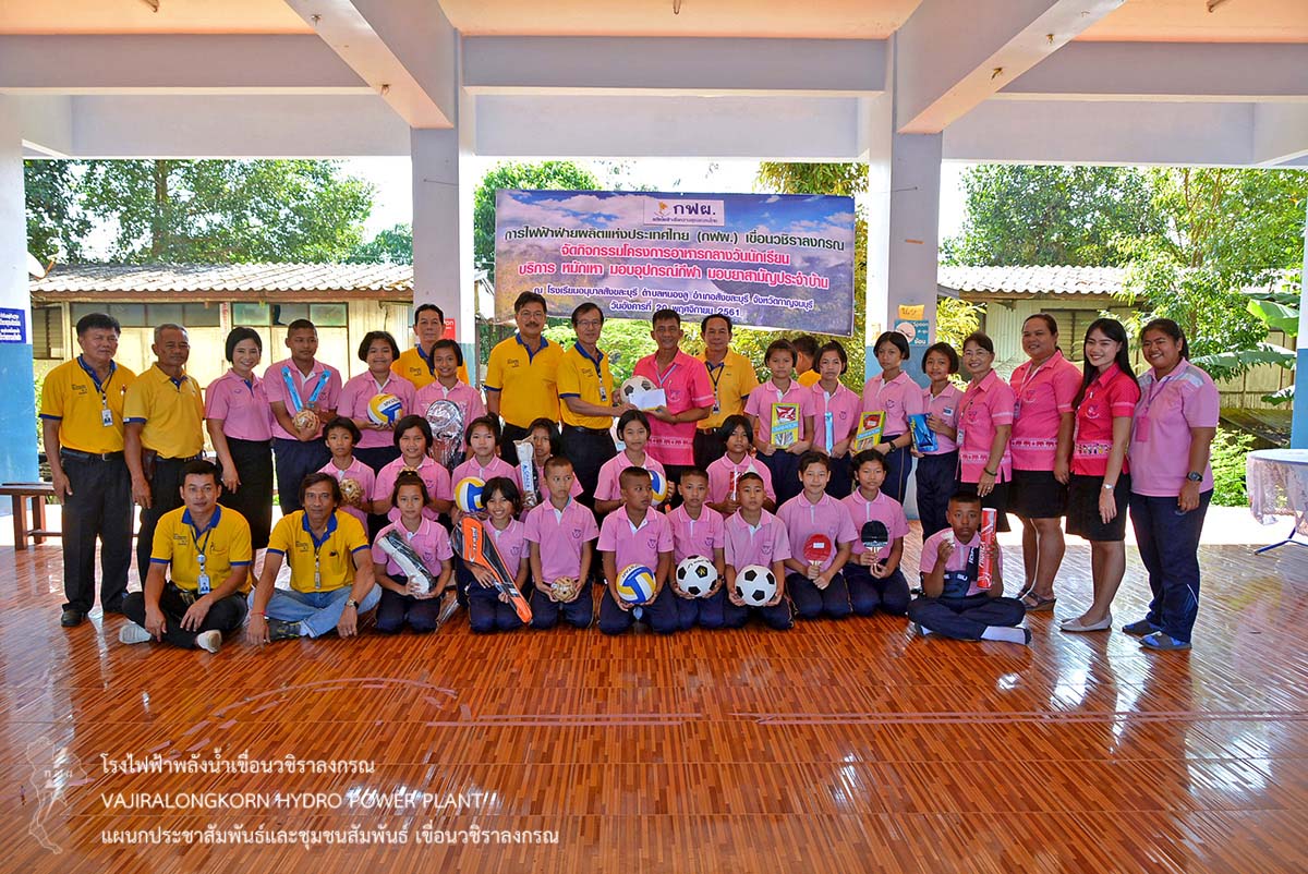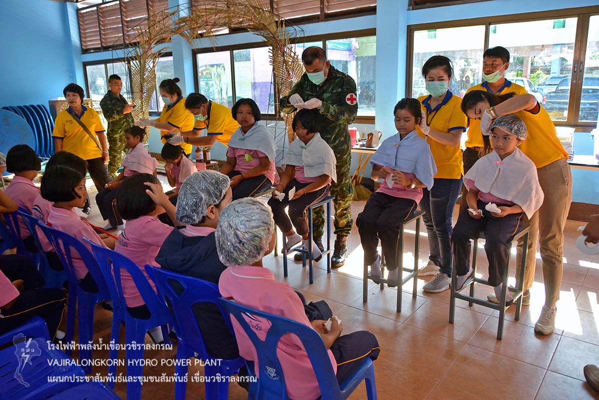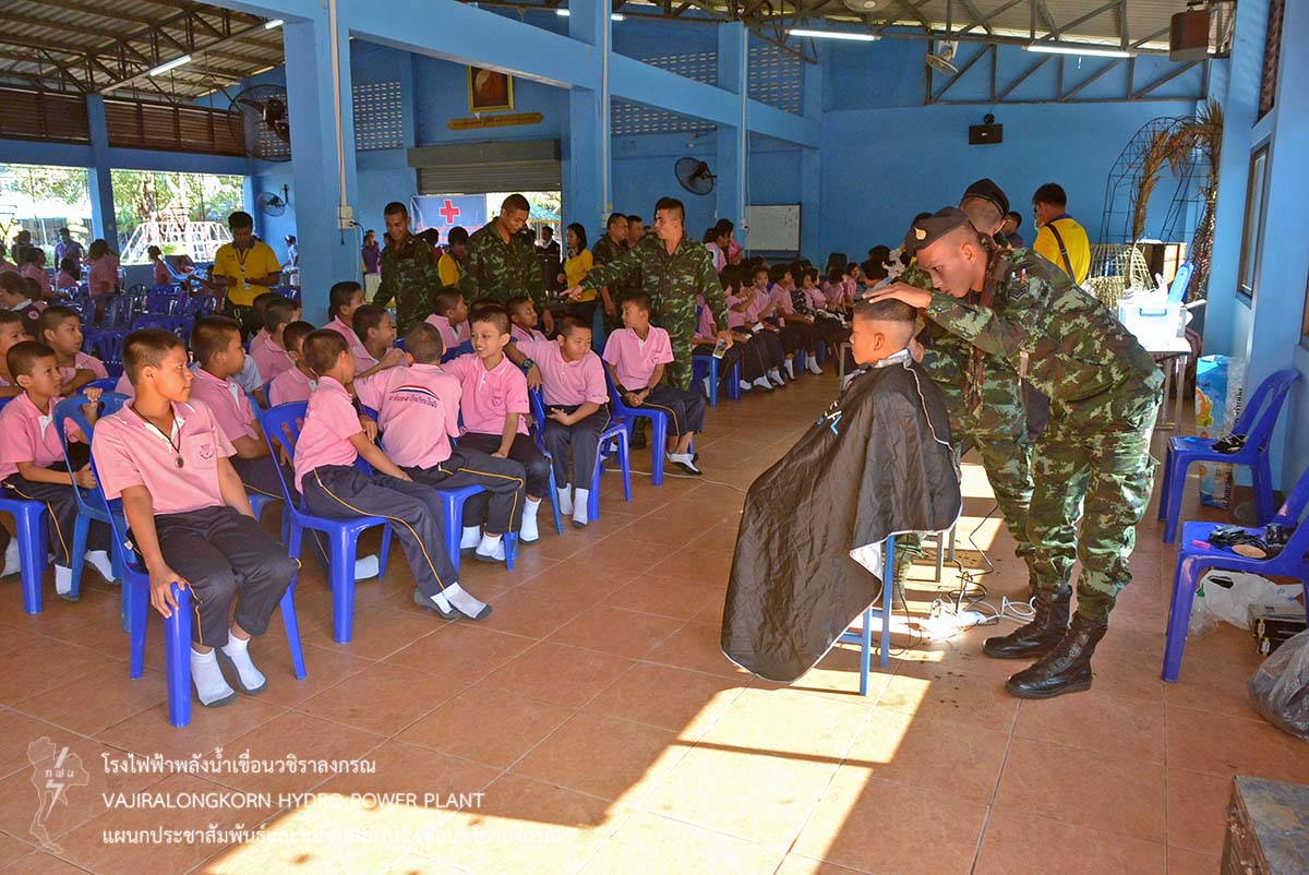 พร้อมกันนี้เขื่อนวชิราลงกรณ ได้จัดโครงการชุมชนสัมพันธ์ให้บริการตัดผม กำจัดเหาเด็กนักเรียน และจัดเลี้ยงอาหารกลางวันเด็กนักเรียน พร้อมกับมอบเงินสนับสนุนโครงการอาหารกลางวัน อุปกรณ์กีฬา น้ำดื่มทิพย์แควน้อย และยาสามัญประจำบ้านให้กับโรงเรียนอนุบาลสังขละบุรี โดยนายพีรฉัตร น้อยเคียง ผู้อำนวยการโรงเรียนอนุบาลสังขละบุรีเป็นผู้รับมอบ