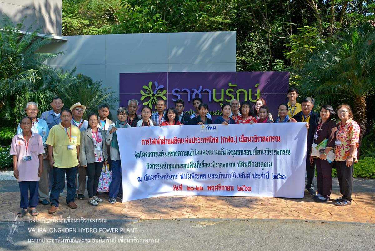 เมื่อวันที่ 21-22 พฤศจิกายน 2561 นายสม ขุมโมกข์ หัวหน้าแผนกประชาสัมพันธ์และชุมชนสัมพันธ์ เขื่อนวชิราลงกรณ นำคณะทำงานโครงการชีววิถีเพื่อการพัฒนาอย่างยั่งยืน กฟผ. ชุมชนพื้นที่อำเภอทองผาภูมิ และชุมชนอำเภอสังขละบุรี 21 พื้นที่ จำนวน 31 คน เข้าศึกษาดูงานศูนย์เรียนรู้ราชานุรักษ์ และเยี่ยมชมโรงไฟฟ้าเขื่อนศรีนครินทร์ โดยมีนายสุกิจ ยิ่งยง ช่างระดับ 8 แผนกเดินเครื่องกะ 3 กองเดินเครื่อง เขื่อนศรีนครินทร์ เป็นวิทยากรบรรยาย ต่อมานำชุมชนเยี่ยมชมศูนย์เรียนรู้ตามหลักปรัชญาเศรษฐกิจพอเพียงเพื่อการพัฒนาอย่างยั่งยืน ฟาร์มพีระพล โดยมีนางนัยนา มงคลกาญจนคุณ ให้การต้อนรับและบรรยายเกี่ยวกับการการแปรรูปผลิตภัณฑ์การเกษตร กระบวนการทำการเกษตรแบบผสมผสาน การจัดทำบัญชีครัวเรือน รวมถึงการนำผลไม้ออแกนิคส่งออกต่างประเทศ