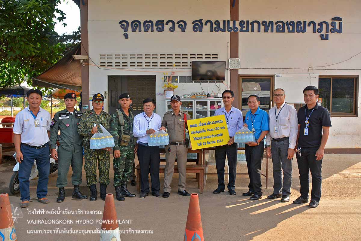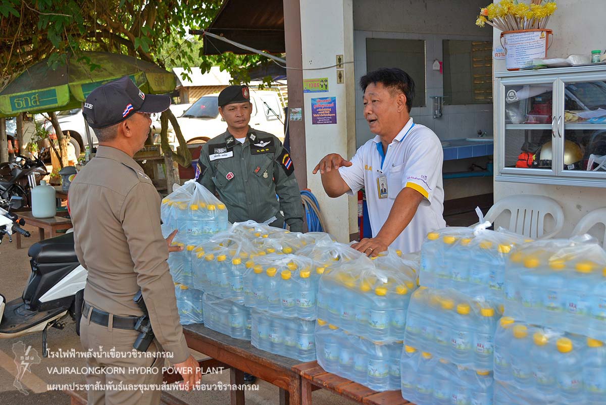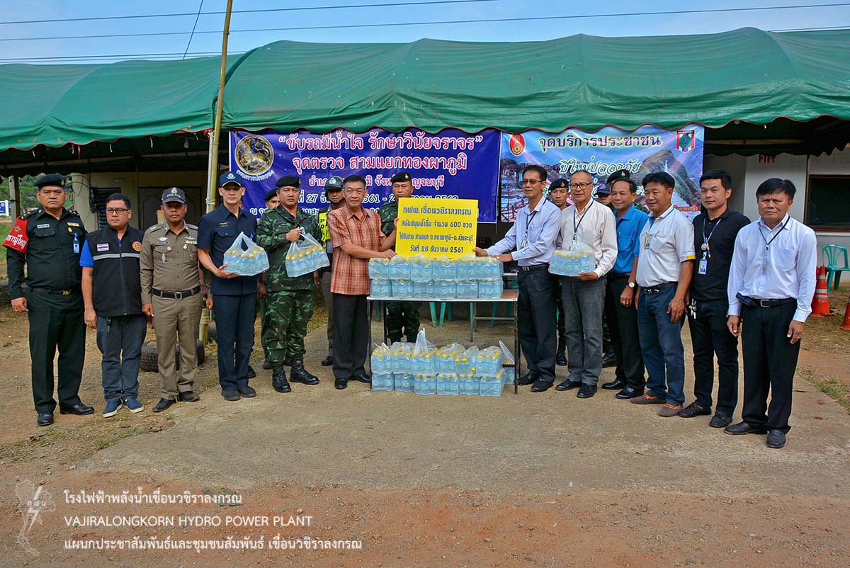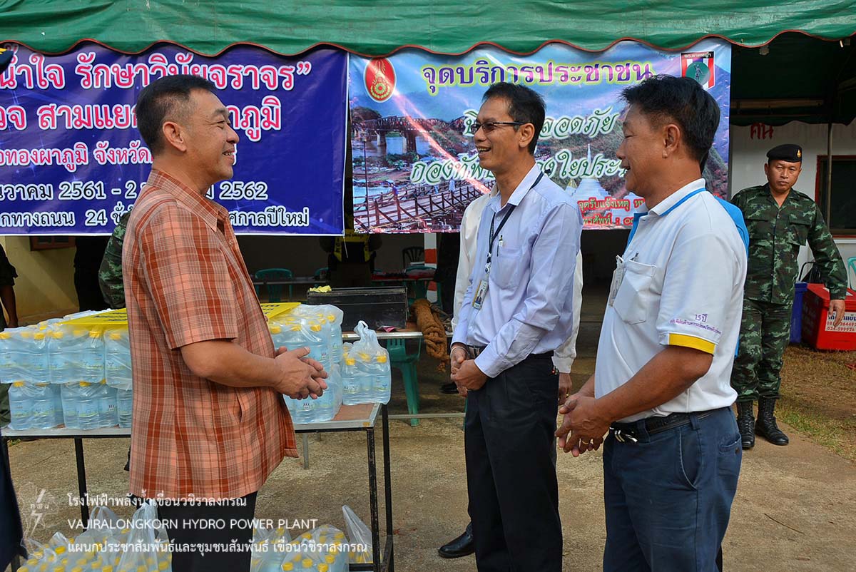 เมื่อวันที่ 28 ธันวาคม 2561 นายธนสาร ฐานะวุฑฒ์ ผู้ช่วยผู้อำนวยการเขื่อนวชิราลงกรณ 2 พร้อมด้วยผู้ปฏิบัติงานเขื่อนวชิราลงกรณ มอบน้ำดื่ม น้ำใจกฟผ. ขนาดบรรจุ 350 ซีซี จำนวน 1,700 ขวด สนับสนุนภารกิจโครงการเฝ้าระวัง 7 วันอันตราย ในช่วงเทศกาลส่งท้ายปีเก่า ต้อนรับปีใหม่ โดยแบ่งเป็น 2 จุด คือ จุดบริการประชาชนอำเภอมองผาภูมิและเทศบาลตำบลทองผาภูมิ จำนวน 1,100 ขวด และสามแยกอำเภอทองผาภูมิ - อำเภอสังขละบุรี จำนวน 600 ขวด โดยมีอำเภอทองผาภูมิ หน่วยพัฒนาการเคลื่อนที่ 11 สถานีตำรวจทองผาภูมิ โรงพยาบาลทองผาภูมิ เทศบาลตำบลทองผาภูมิ ให้บริการจัดเจ้าหน้าที่อำนวยความสะดวกในการเดินทางระหว่างวันที่ 27 ธันวาคม 2561 ถึงวันที่ 2 มกราคม 2562