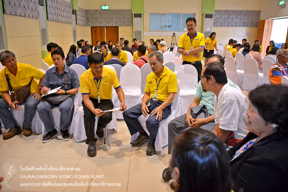ต่อมาจัดประชุมเพื่อแลกเปลี่ยนความคิดเห็น ข้อกังวลใจ ข้อสงสัย ระหว่าง กฟผ. เขื่อนวชิราลงกรณ และชุมชนรอบเขื่อนฯ โดยมีนายไววิทย์ แสงพานิชย์ ผู้อำนวยการเขื่อนวชิราลงกรณ เป็นประธาน โดยเปิดโอกาสให้แต่ละชุมชนถามตอบแลกเปลี่ยนความคิดเห็น ข้อกังวลใจ ข้อสงสัยร่วมกับตัวแทนผู้รับผิดชอบศูนย์เรียนรู้ของเขื่อนวชิราลงกรณ ณ อาคารภูมิสุวรรณ เขื่อนวชิราลงกรณ จากนั้นท่านผู้ช่วยผู้อำนวยการ เขื่อนวชิราลงกรณ-1,ผู้บริหาร ,คณะทำงานเขื่อนฯ และชุมชนรับประทานอาหารกลางวันร่วมกัน