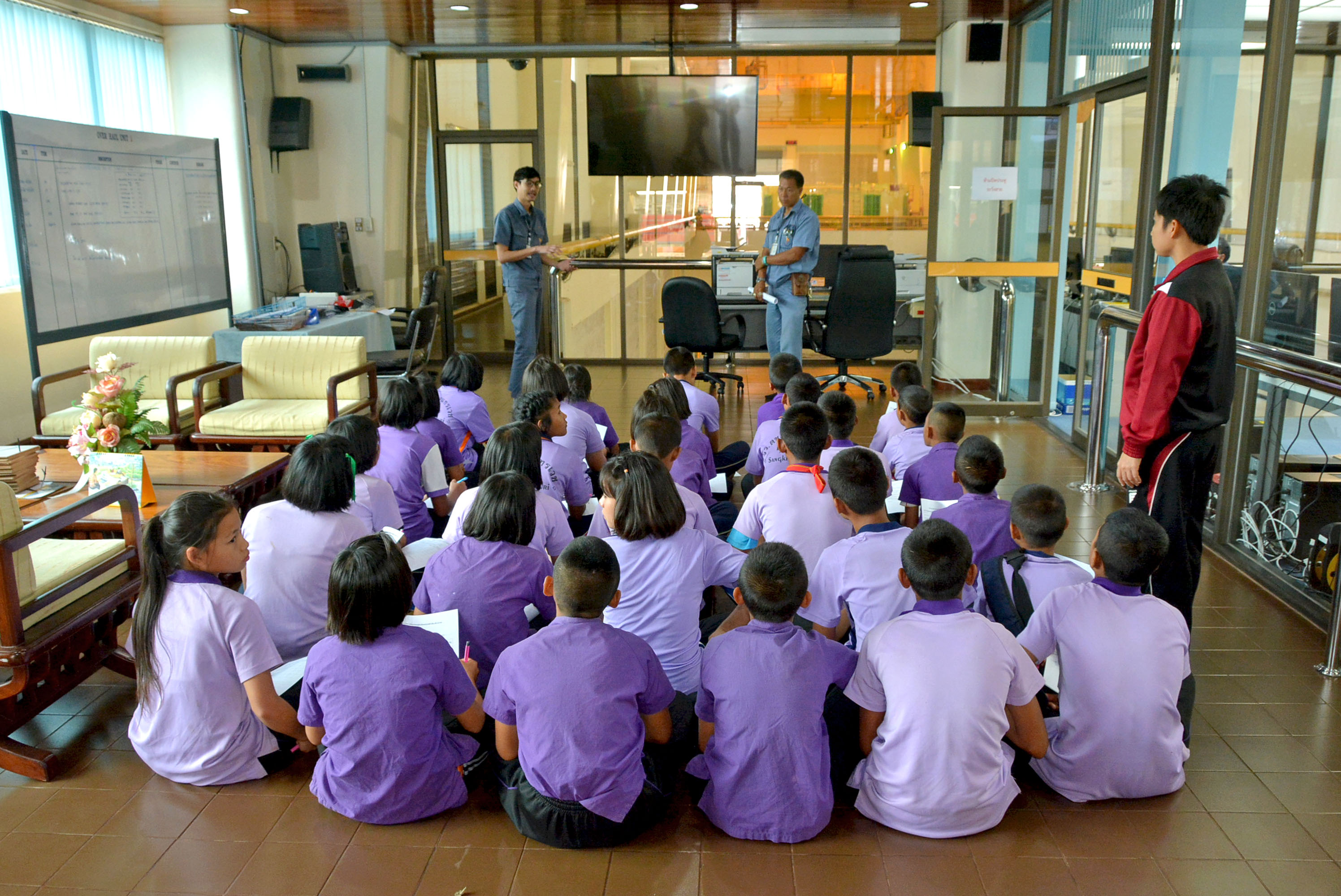 ต่อมานายพฤทธา พฤกษเมธาพันธ์ ช่างระดับ 5 แผนกประชาสัมพันธ์และชุมชนสัมพันธ์ นำคณะครูและนักเรียนโรงเรียนตำรวจตระเวนชายแดนสุนทรเวช เข้ารับฟังบรรยายสรุปขั้นตอนการผลิตพลังงานไฟฟ้า ณ แผนกเดินเครื่อง กองเดินเครื่อง โดยมีนายเกรียงไกร กระจ่างแจ้ง ช่างระดับ 7 แผนกเดินเครื่อง กะ3 และนายนภัสร์ ขิยะพัฒน์ ช่างระดับ 5 แผนกเดินเครื่อง กะ3 กองเดินเครื่อง ให้การต้อนรับและบรรยายสรุป