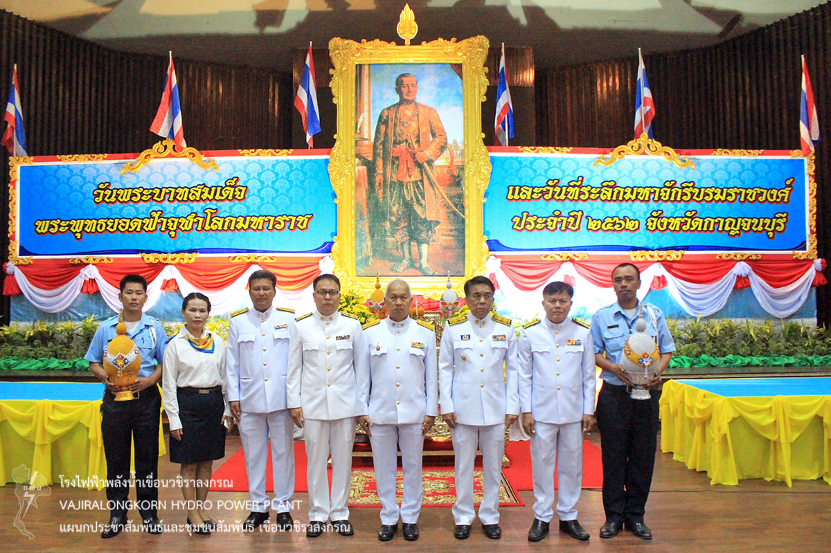 เมื่อวันที่ 6 เมษายน 2562 นายบรรจบ เชื้อสุข หัวหน้ากองบำรุงรักษาโยธา ตัวแทน ผู้อำนวยการเขื่อนศรีนครินทร์ นายสม ขุมโมกข์ หัวหน้าแผนกประชาสัมพันธ์และชุมชนสัมพันธ์ ตัวแทน ผู้อำนวยการเขื่อนวชิราลงกรณ พร้อมด้วยผู้ปฏิบัติงาน เข้าร่วมพิธีวางพานพุ่มทอง และพานพุ่มเงิน เพื่อถวายราชสักการะเนื่องในวันพระบาทสมเด็จพระพุทธยอดฟ้าจุฬาโลกมหาราช และวันที่ระลึกมหาจักรีวงศ์ ประจำปี 2562 จังหวัดกาญจนบุรี โดยมีนายบวรศักดิ์ วานิช รองผู้ว่าราชการจังหวัดกาญจนบุรี เป็นประธานในพิธีพร้อมด้วยหน่วยงานข้าราชการ รัฐวิสาหกิจ องค์การปกครองส่วนท้องถิ่น มหาวิทยาลัย และสถานศึกษา จังหวัดกาญจนบุรี ร่วมกันเพื่อแสดงความกตัญญูกตเวทีในพระมหากรุณาธิคุณแด่พระบาทสมเด็จพระพุทธยอดฟ้าจุฬาโลกมหาราชและพระมหากศัตริย์แห่งราชวงศ์จักรีทุกพระองค์
