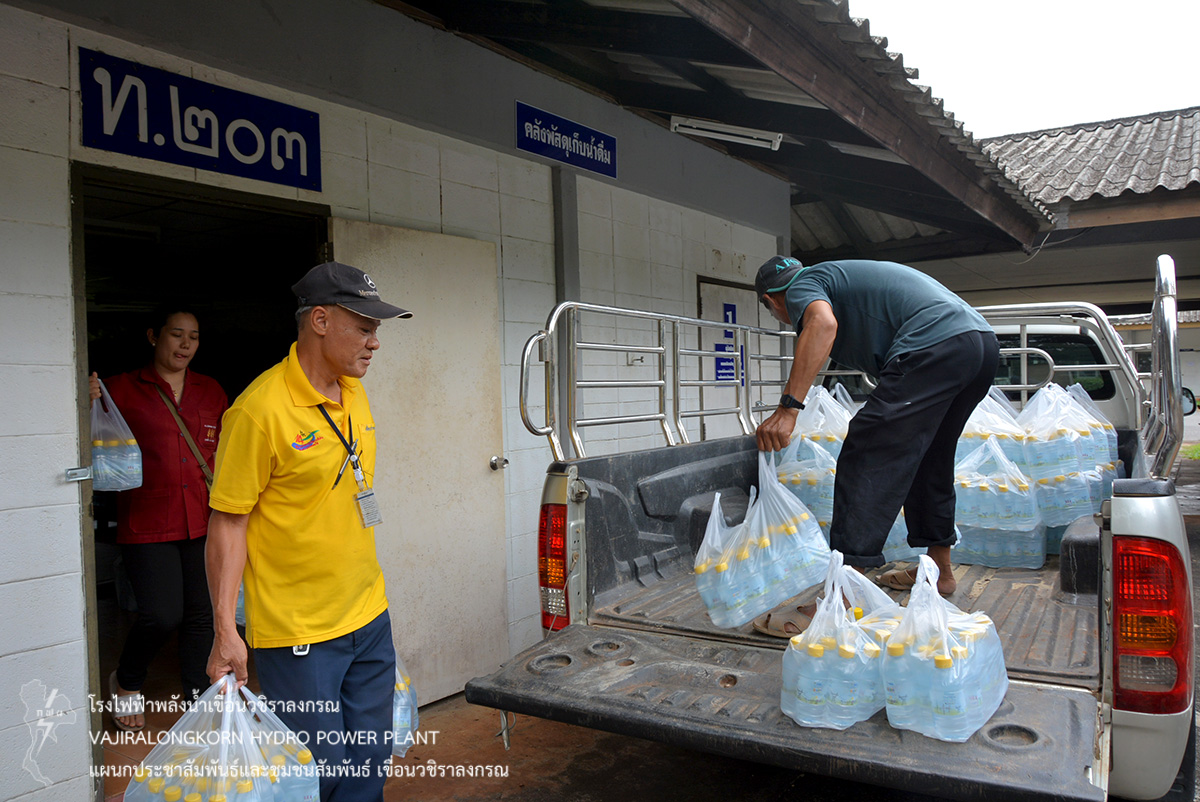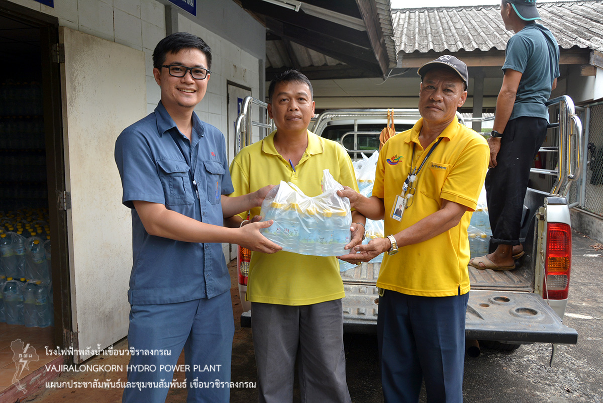 เมื่อวันที่ 16 พฤษภาคม 2562 นายพงศ์ภูมิ จิรวาณิช แผนกบริหารพัสดุเขื่อนวชิราลงกรณ เป็นตัวแทนผู้อำนวยการเขื่อนวชิราลงกรณ มอบน้ำดื่มน้ำใจ กฟผ. ขนาด 350 ซีซี จำนวน 1,500 ขวด ให้กับตัวแทนวัดอู่ล่อง ตำบลท่าขนุน อำเภอทองผาภูมิ จังหวัดกาญจนบุรี เพื่อใช้ในงานยกฉัตรยอดเจดีย์ทอง ระหว่าง 17-19 พฤษภาคม 2562