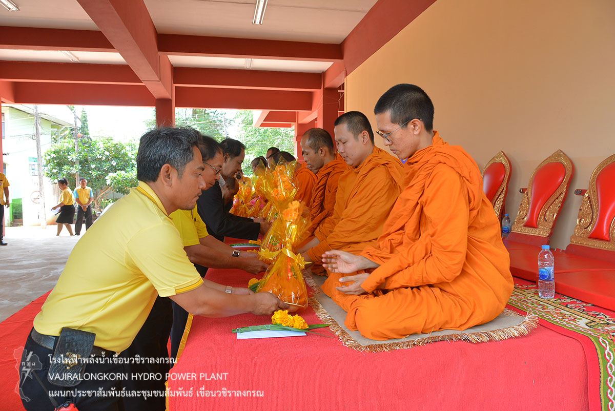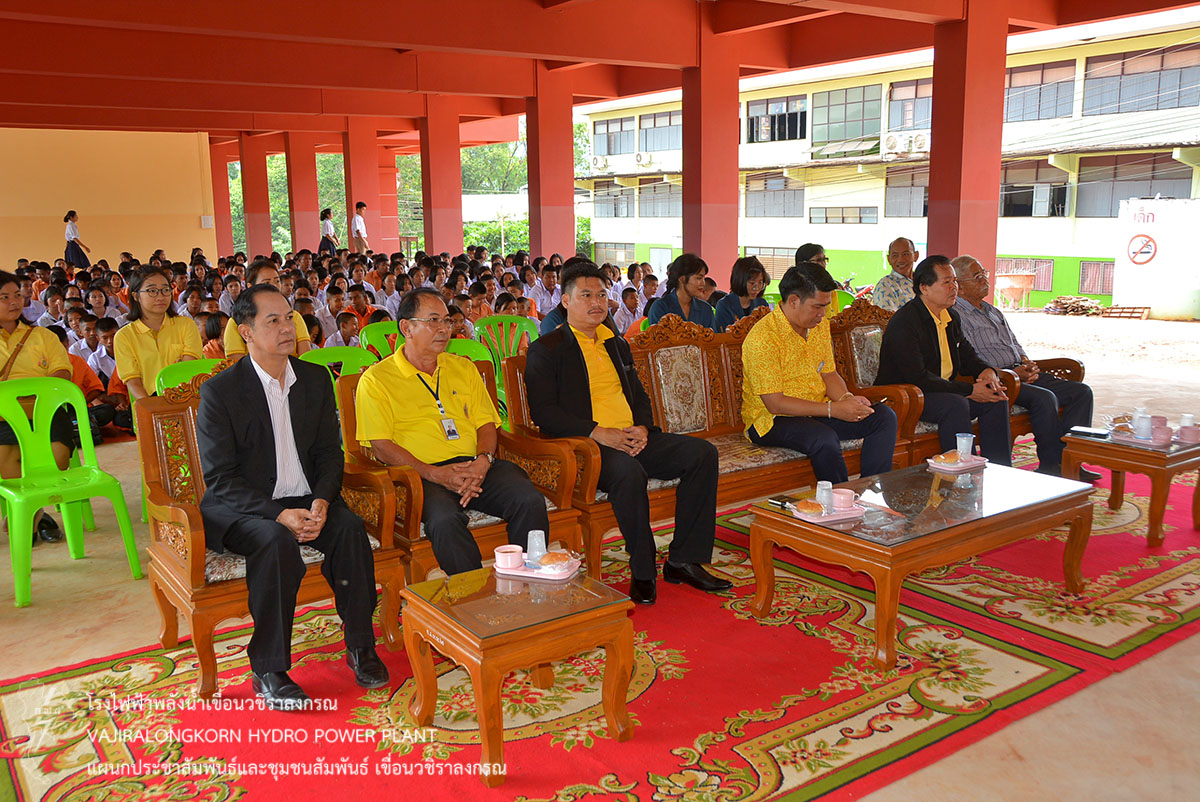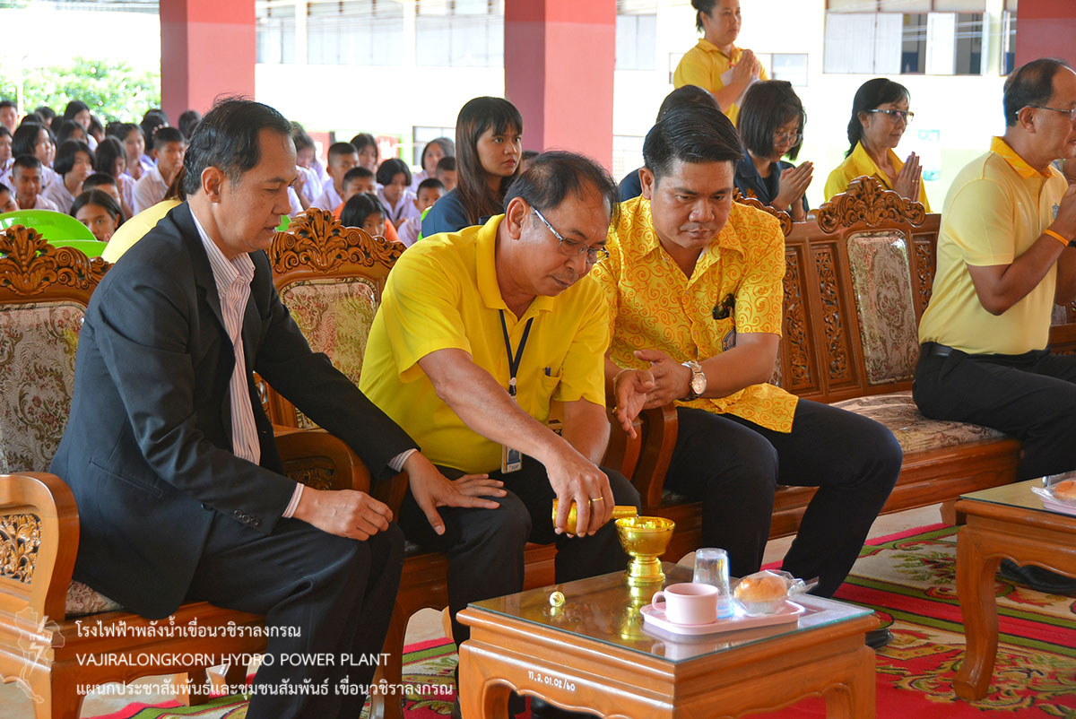 เมื่อวันที่ 17 พฤษภาคม 2562 นายเชน ตันเจริญ หัวหน้ากลุ่มงานวิชาการและวางแผน เขื่อนวชิราลงกรณ พร้อมด้วยนางอรณี ชุติมณฑ์เลิศ พนักงานวิชาชีพระดับ 8 กลุ่มงานวิชาการและวางแผน เขื่อนวชิราลงกรณ เป็นผู้แทนผู้อำนวยการเขื่อนวชิราลงกรณ ร่วมงานทำบุญอาคารเรียนหลังใหม่ ณ โรงเรียนทองผาภูมิวิทยา อำเภอทองผาภูมิ จังหวัดกาญจนบุรี และร่วมพิธีทำบุญเลี้ยงพระสงฆ์ จำนวน 9 รูป พร้อมด้วยคณะครู และนักเรียน ในเขตอำเภอทองผาภูมิและผู้มีเกียรติเข้าร่วมงาน