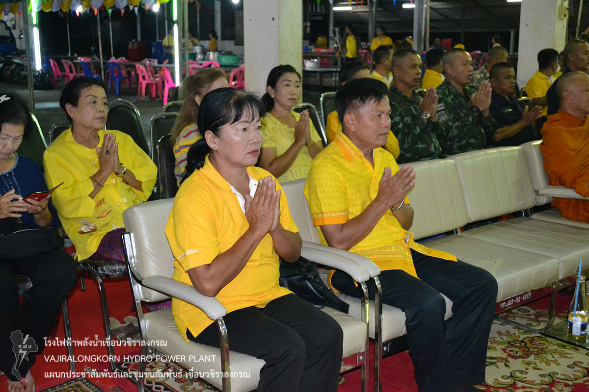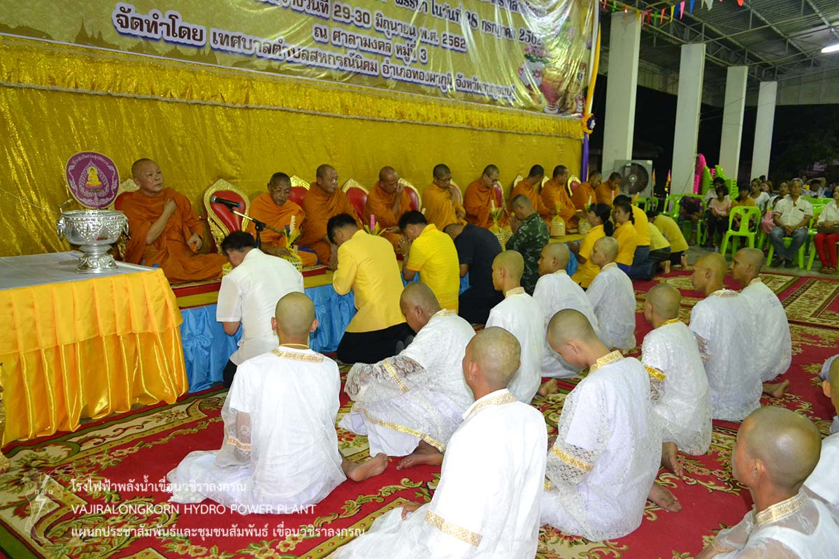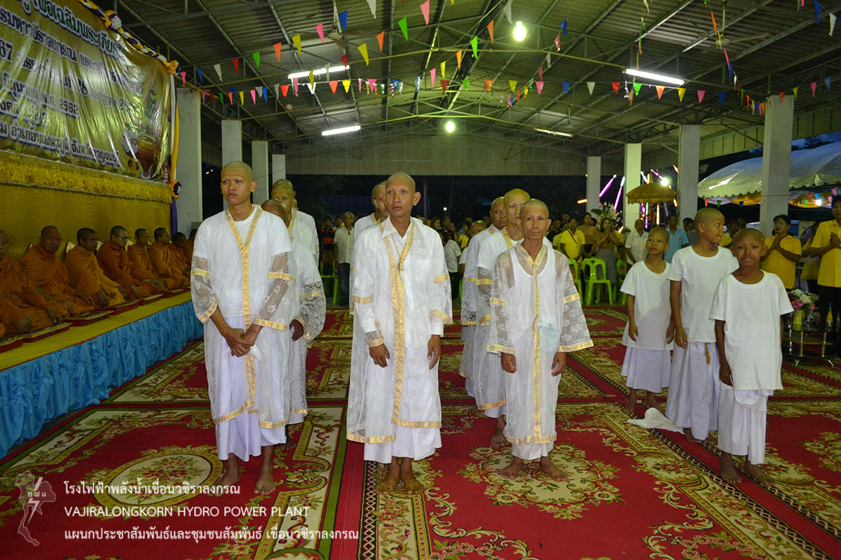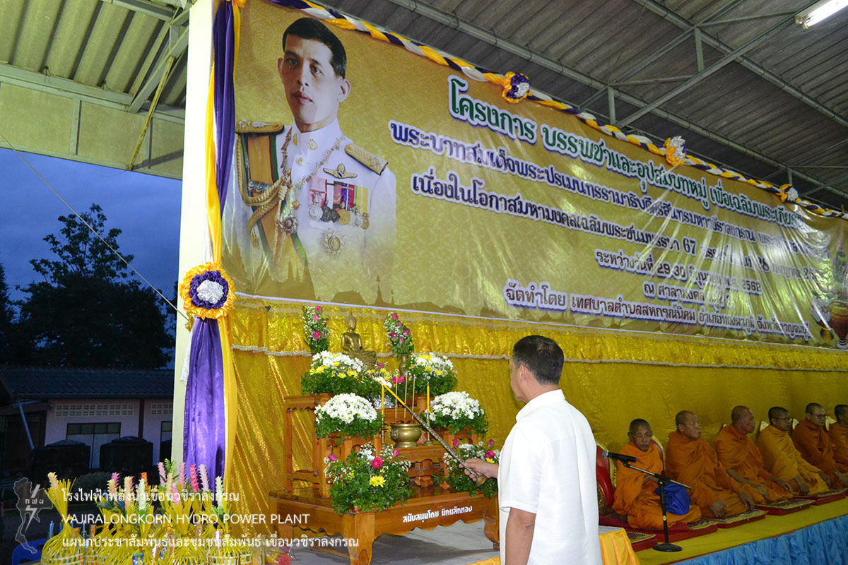 เมื่อวันที่ 29 มิถุนายน 2562 นายสม ขุมโมกข์ หัวหน้าแผนกประชาสัมพันธ์และชุมชนพันธ์ เขื่อนวชิราลงกรณ เป็นตัวแทนผู้อำนวยการเขื่อนวชิราลงกรณ ร่วมพิธีบรรพชาและอุปสมบทหมู่เพื่อเฉลิมพระเกียรติพระบาทสมเด็จพระวชิราเกล้าเจ้าอยู่หัว เนื่องในโอกาสมหามงคลเฉลิมพระชนมพรรษา 67 พรรษา ในวันที่ 28 กรกฎาคม 2562 ณ ศาลามงคล หมู่ 3 ตำบลสหกรณ์นิคม อำเภอสังขละบุรี จังหวัดกาญจนบุรี โดยมีนายสืบสาย ศักดิ์โสภิษฐ์ นายอำเภอทองผาภูมิ เป็นประธานในพิธี โอกาสนี้เขื่อนวชิราลงกรณได้ร่วมสนับสนุนเงินทำบุญ โดยมีนายสำรวม ใจซื่อ นายกเทศมนตรีตำบลสหกรณ์นิคมเป็นผู้รับมอบ